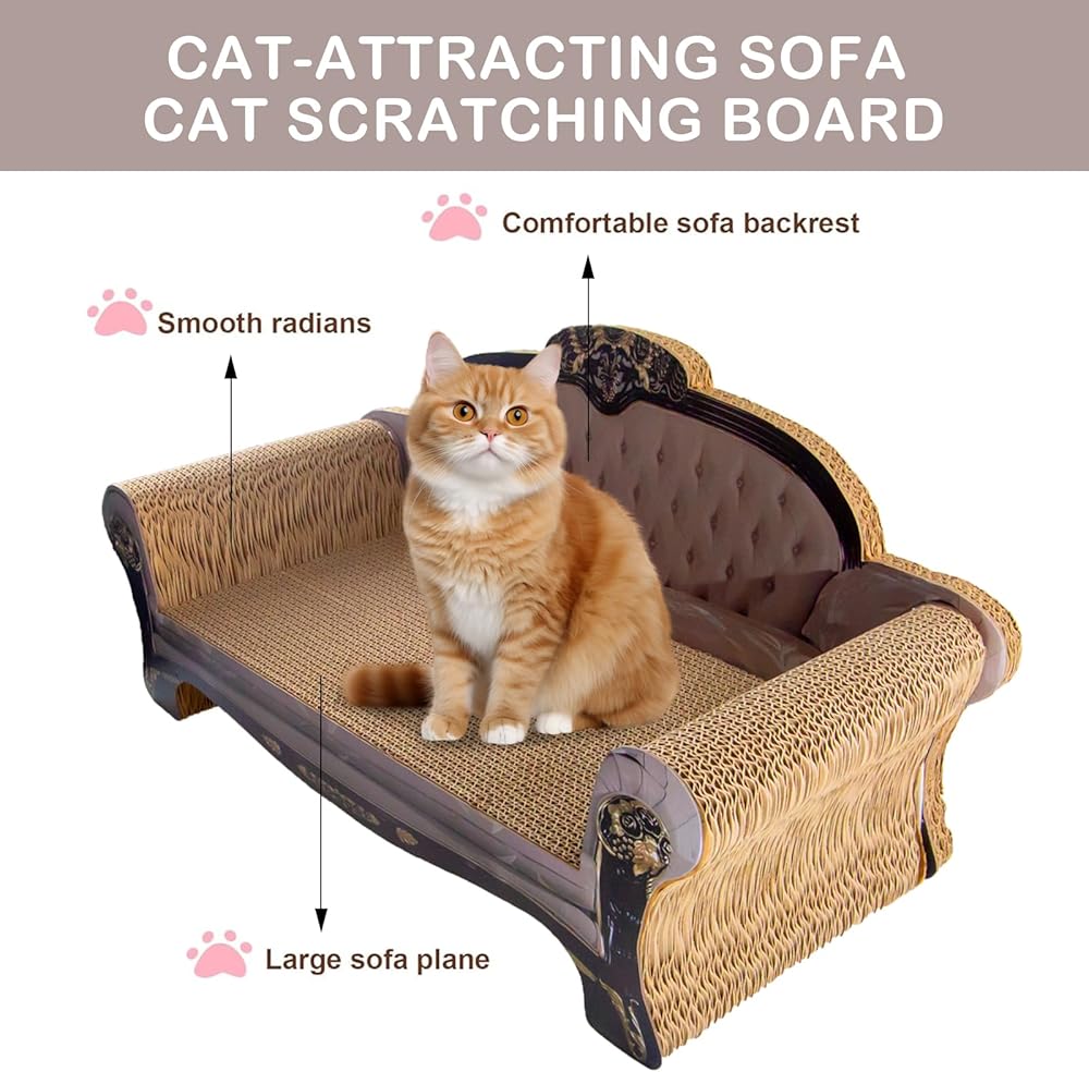 THICK AND SOLID: the cat scratcher couch made of high-quality cardboards with solid structure is safe and comfortable for cats to rest or scratch, we use thicker cardboards to ensure that cats can sit more stably on his/her exclusive couch, and it is close enough to the ground that you won't have to worry about rolling off.