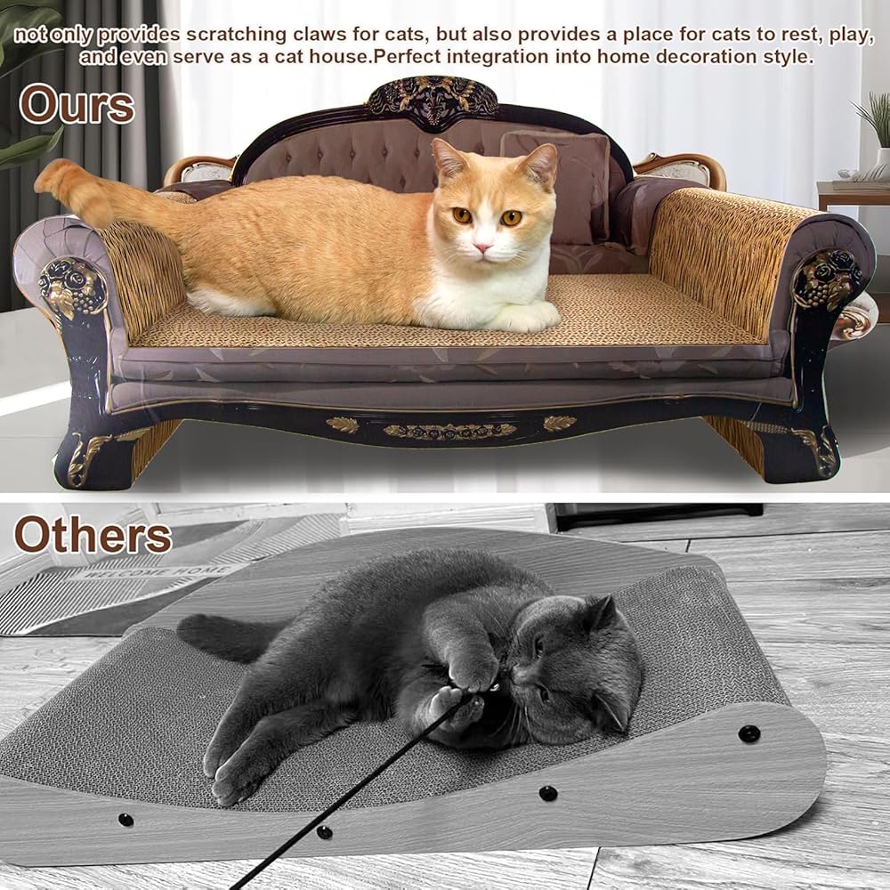 QUICK TO INSTALL: we have upgraded the design of the scratcher couch, the cardboards have already been put into the right place, all you have to do is use double-sided tapes to tape the back on the scratcher couch.