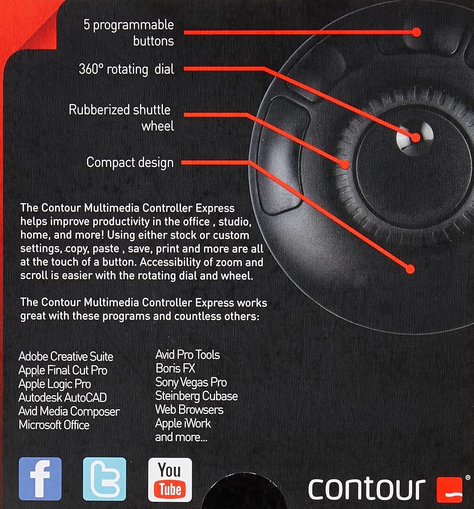 Contour Multimedia Controller Xpress is a compact multi-media controller, based on the award-winning Multimedia Controller PRO v2 and gives you programmability and control over most of today's popular multi-media and office based programs. Designed for the traveller or light user, well established design ergonomics make sure that Xpress fits comfortably under one hand. Connecting to your computer via USB, Multimedia Controller Xpress will give you greater control over a whole range of Mac & PC based applications. Portable, lightweight and cost effective. Multimedia Controller Xpress allows precision editing for your digital timeline based projects, or improved workflow in popular office based applications, whilst on the move. With five programmable buttons, a jog dial, the Xpress can be used for a number of applications ranging from photo editing and medical imaging to word processing and data entry. For creative digital timeline based apps, the fully responsive rotating dial and outer jog control give you analogue style feedback, making it perfect for reviewing video clips and editing audio tracks. Simply use the inner dial to scan your media frame by frame, or use the outer ring to allow multi-speed scanning backwards and forwards on your timeline. Even better, with other apps, the jog wheel can be used to preview and edit photos, scroll up and down websites, navigate spreadsheets making it so much more than a timeline focused tool.