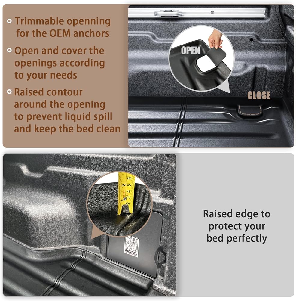 Design: Our trunk bed liner is designed according to the OEM contour which makes it sit perfectly flush and secure the mat in place. The 3D anti-slip texture prevents your items from sliding around the bed. Raised edges all around can prevent your bed from spills and prevent water and dirt go underneath. [Note: Designed with trimmable openings for OEM anchors and you can open or cover it if needed.]
