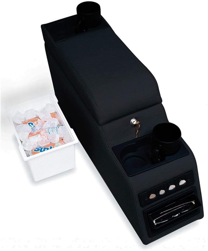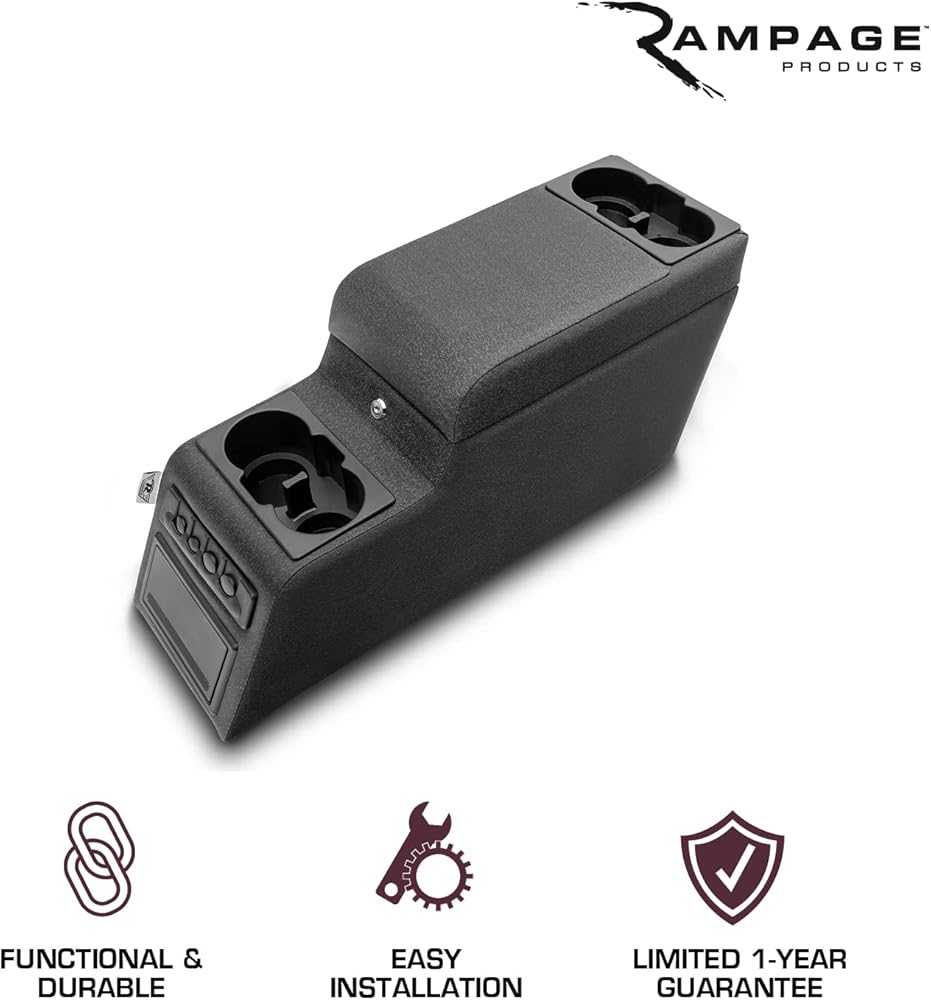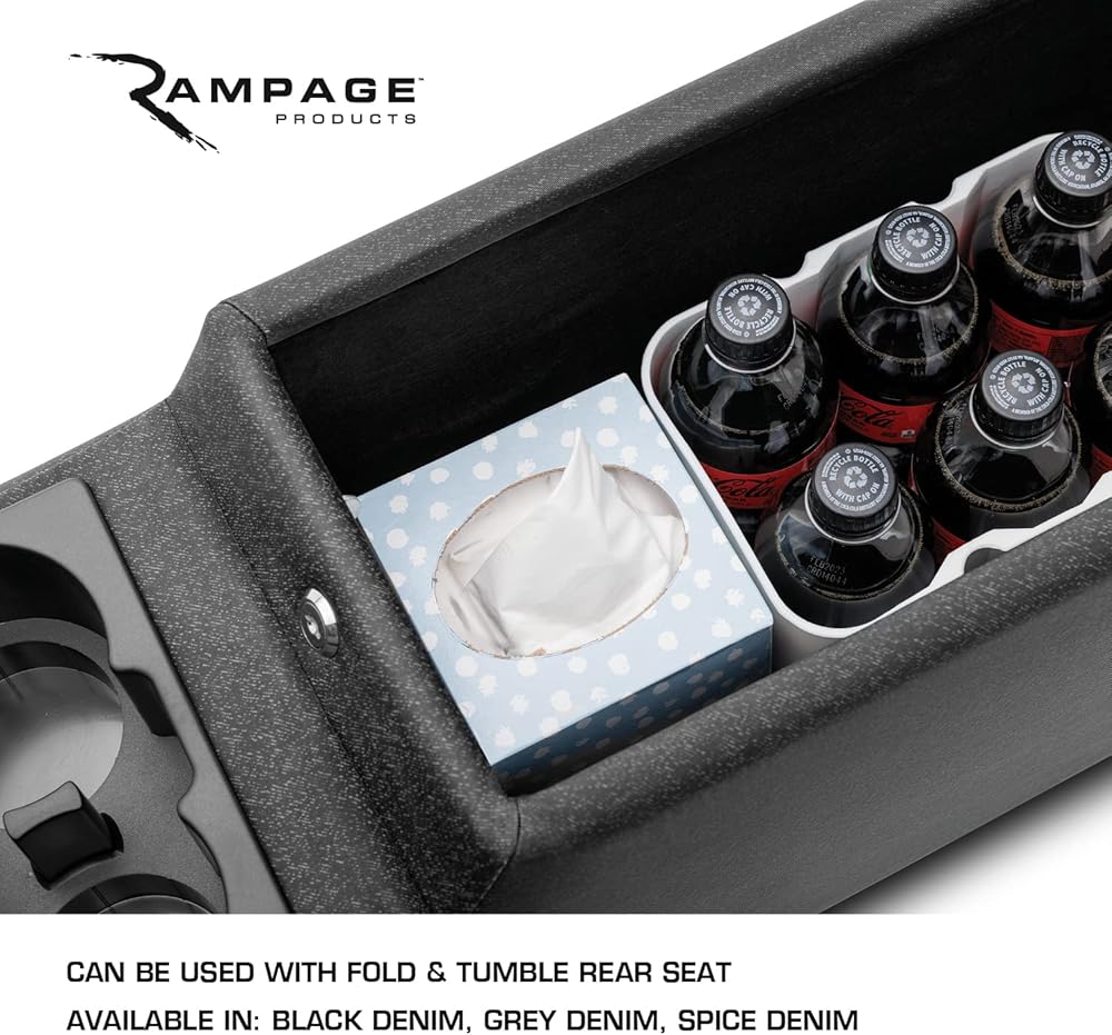 Rampage Denim Black Locking Center Console is designed to provide an efficient solution for our various needs such as additional storage, facilitate writing during travel, arm rest and organizer. This center console includes 2 sets of cup holders that facilitate the front and rear passengers to safely secure hot and cold beverages. It also consists of a large comfortable padded armrest along with a writing area. This center console features a large storage compartment along with a removable organizer change tray. Recessed, removable cooler holds a 6 pack of soda.
