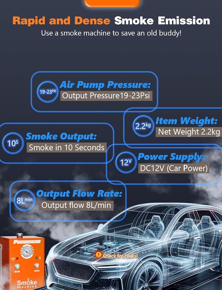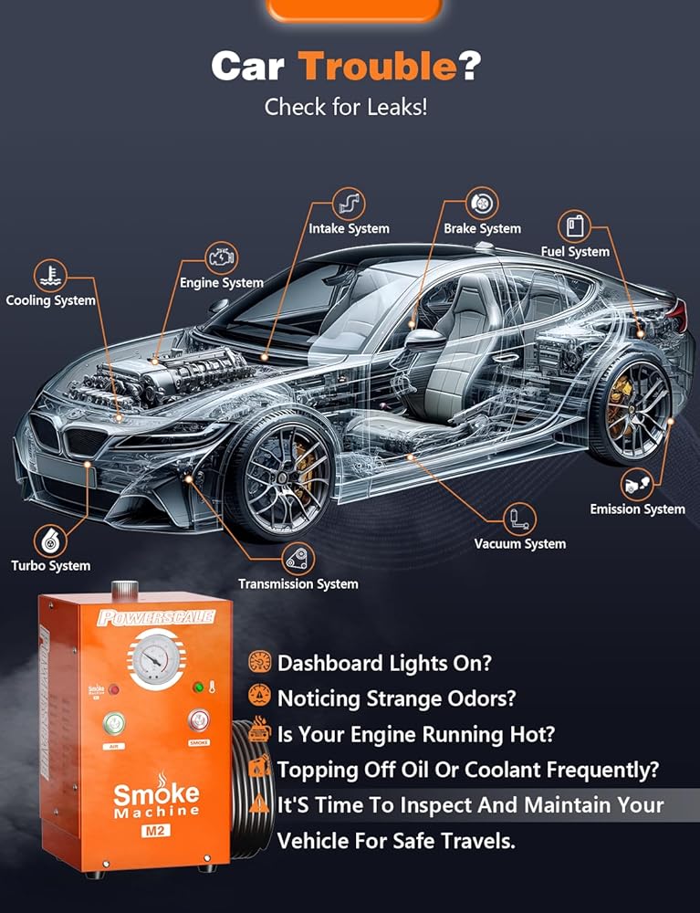🚗【كشف شامل للتسرب】يمكن لآلة دخان السيارات Powerscale M2 فحص المركبات المختلفة بسهولة، بما في ذلك الموديلات القديمة، بحثًا عن تسربات في أعمدة الخانق، وكتل المحرك، وأنظمة اختبار التوربو، وأنظمة علبة المرافق، وأنظمة السحب، وأنظمة العادم، وأنظمة خزان الوقود، وأنظمة EVAP وأنظمة EGR وأنظمة التبريد ووصلات الأنابيب المختلفة.