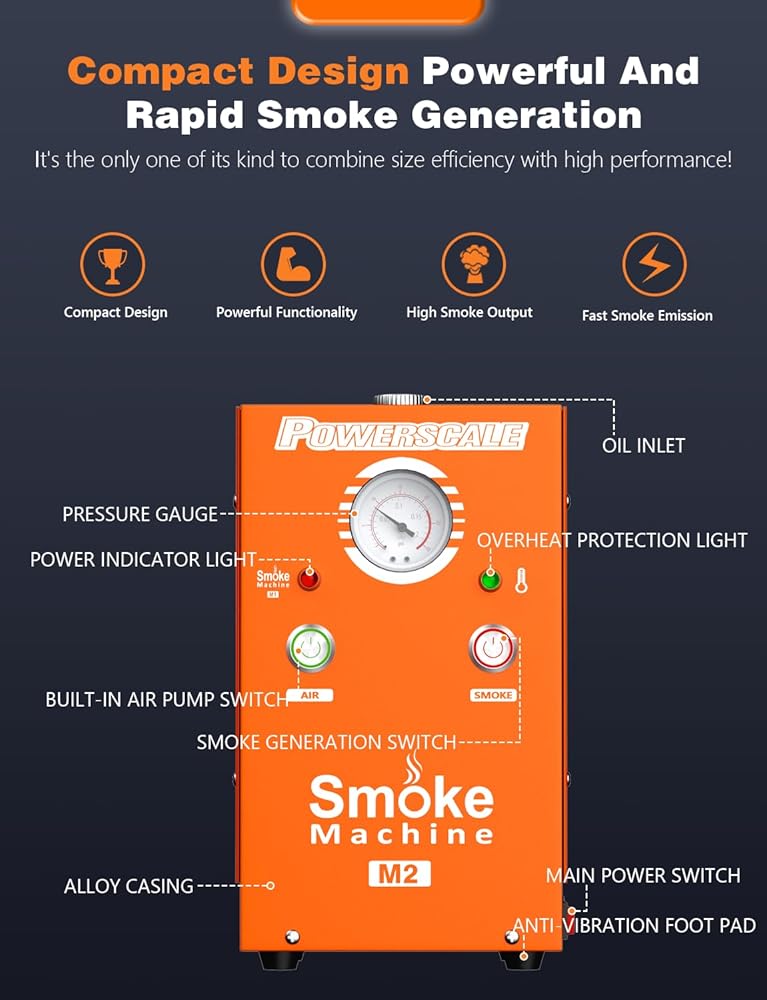 🔥【أداء عالي وبنية متميزة】لا يتطلب Powerscale M2 مصدر هواء خارجي، فهو مزود بمضخة هواء مدمجة ومقياس ضغط. يمكن للضاغط توليد ضغط هواء يتراوح من 19 إلى 23 رطل لكل بوصة مربعة، مما يسمح بإدخال الدخان بسهولة إلى النظام الجاري اختباره، مما يؤدي إلى تسريع عملية اكتشاف التسرب.