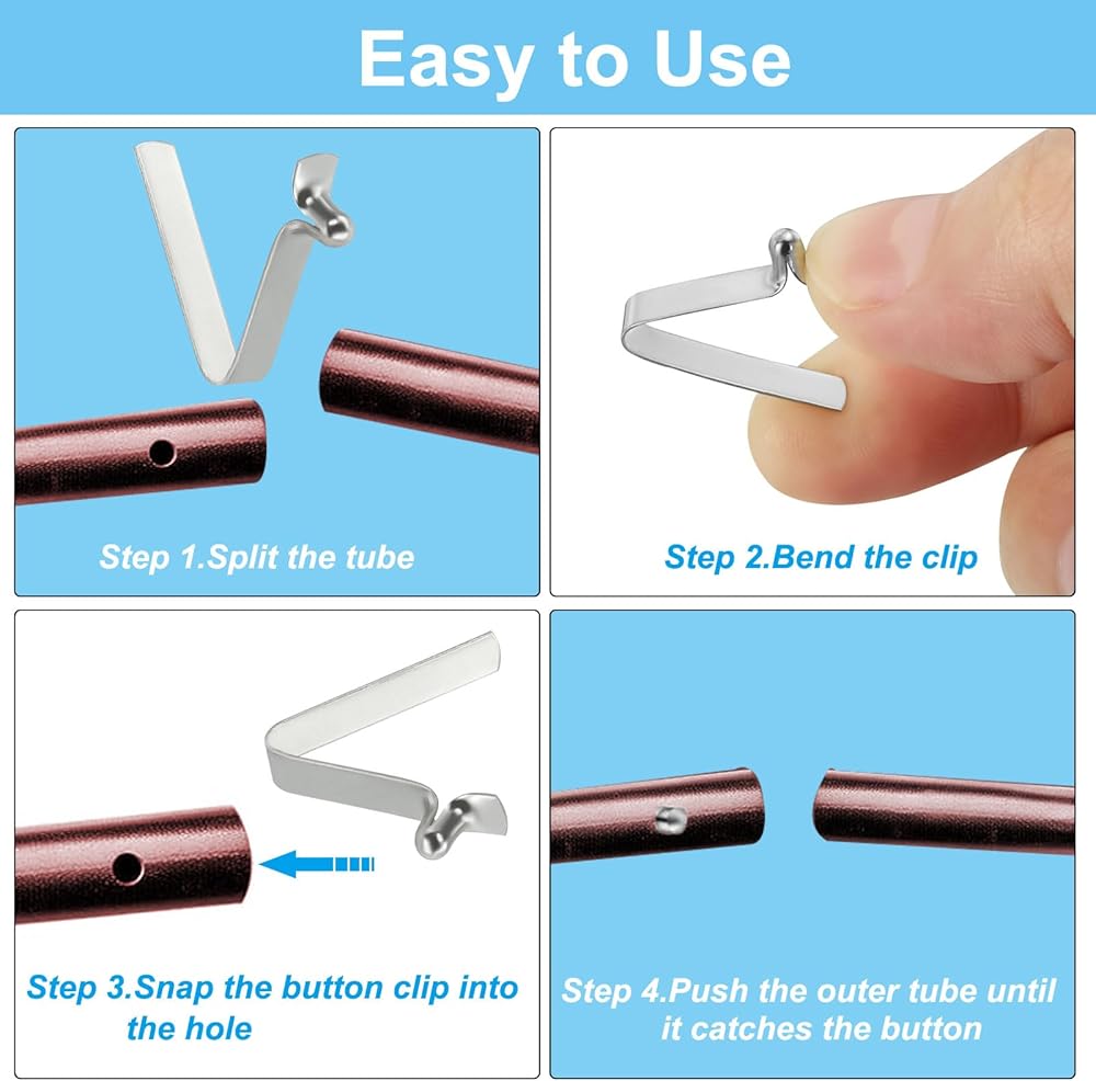 • التعليمات: قم بثني المشبك، ضع المشبك في القضيب، ثم قم بتثبيت مشبك الزر في الفتحة، وادفع الأنبوب الخارجي حتى يمسك الزر.