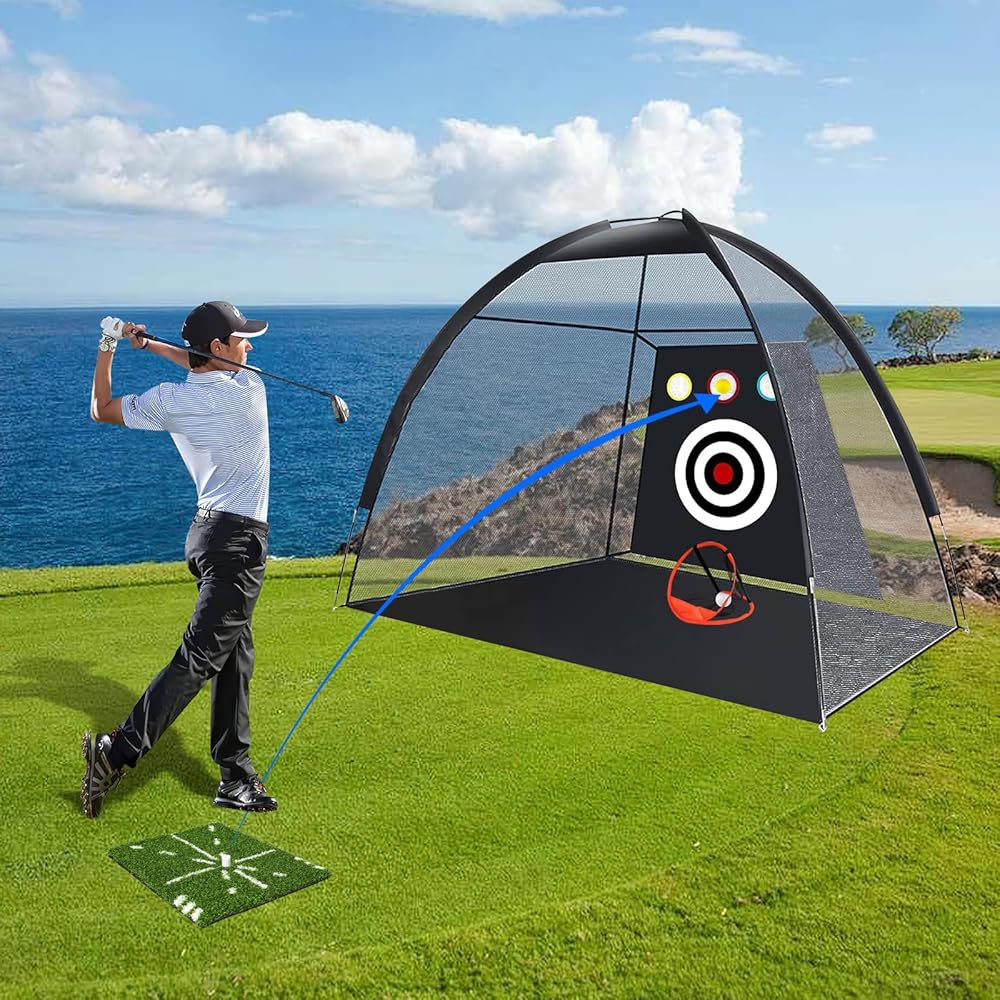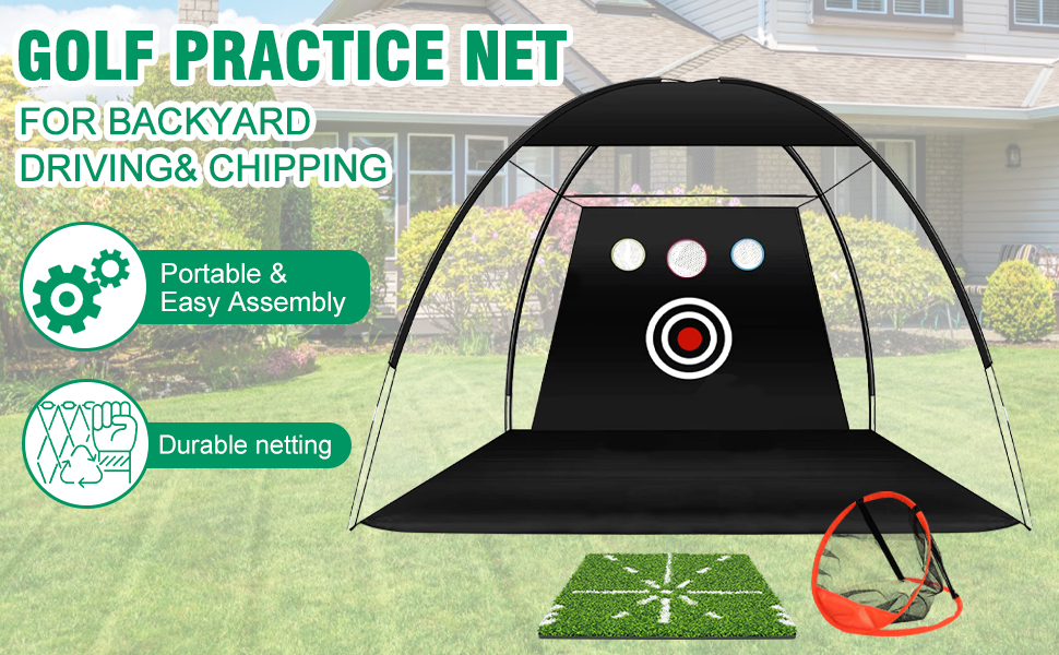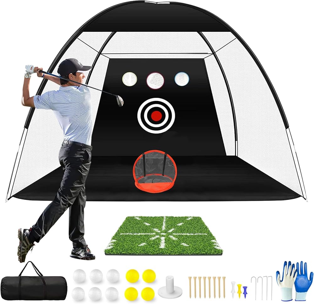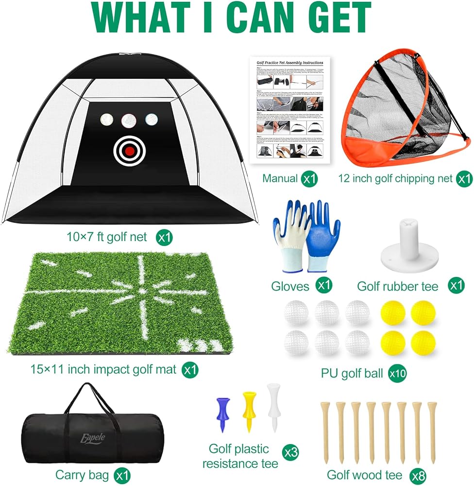 Eapele Golf Net، شبكة ممارسة الجولف الكل في 1، شبكات جولف للقيادة في الفناء الخلفي والمرآب، شبكة ضرب جولف 10 × 7 أقدام مع شبكة تقطيع/هدف/حصيرة/كرات/تي شيرت/حقيبة - هدية للرجال/عشاق الجولف