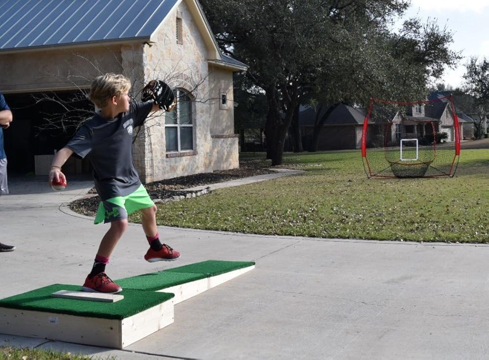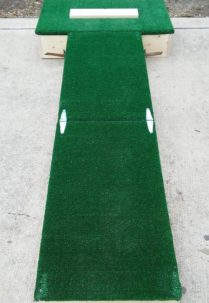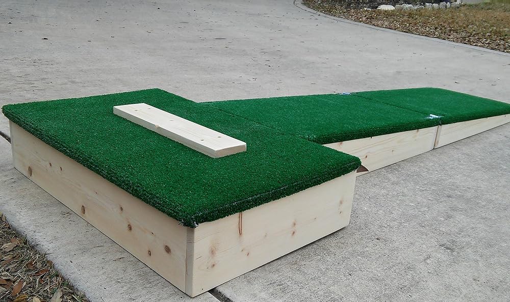 Travel Mound: Regulation slope for 7 - 12 yr. old pitchers: Great For: TRAVEL TEAMS: Lightweight Design, Small Footprint, Sets up in seconds and folds back up in seconds. 32"L x 18"W x 8"H TEAM PRACTICE: working pitchers and catchers while the rest of the team has the field. GAME TIME: pre-game warmup and bull pen while the game is in progress. TRAINING: teaches pitchers to step toward the plate w/ the narrower landing area of 16". Platform is wide enough to start the pitching motion when pitching from the wind up. LESSONS Landing area is on the mound with the correct slope for accurate game simulation saving stress on the arm and knee Specs: Weight: approximately 30 lbs. Height: Regulation 6 inches high to the top of the platform. Slope: Regulation 1 in. drop for every 1 ft. length. Length: 5'7" from pitching plate to end of mound. Total Length: 7' Stack Dimensions: 32"L x 18"W x 8"H Stack construction for easy transport in a car, SUV or truck. Secures together with latches and will not come apart when in use but are simple to unhook when transporting. Covering is heavy duty, double backed astroturf.
