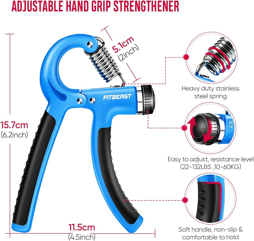 𝗔𝗱𝗷𝘂𝘀𝘁𝗮𝗯𝗹𝗲 𝗥𝗲𝘀𝗶𝘀𝘁𝗮𝗻𝗰𝗲 — يمكنك تخصيص مستوى المقاومة بسهولة من المبتدئ إلى المتقدم، مما يسمح لك بالتقدم بالسرعة التي تناسبك. تسمح لك مستويات المقاومة القابلة للتعديل بالتقدم وتحدي نفسك بمرور الوقت، وهي مثالية للأفراد الذين يتعافون من إصابات اليد أو المعصم، ويمكن أن تساعد مقابض اليد لدينا في إعادة التأهيل وتعزيز البراعة.