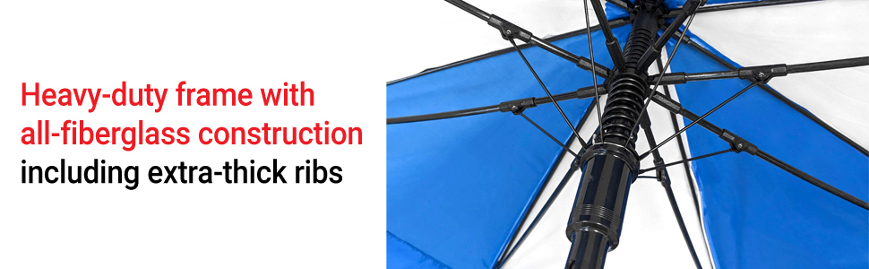 WEATHER THE STORM. The vented canopy and durable, all-fiberglass construction help to windproof this umbrella against strong gusts and to protect it against rust and lightning. High grade Pongee Polyester fabric allows for quick drying.