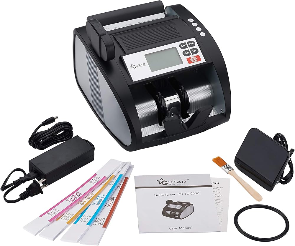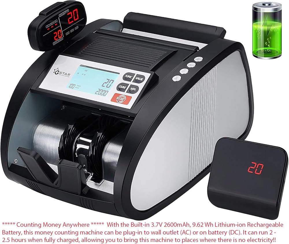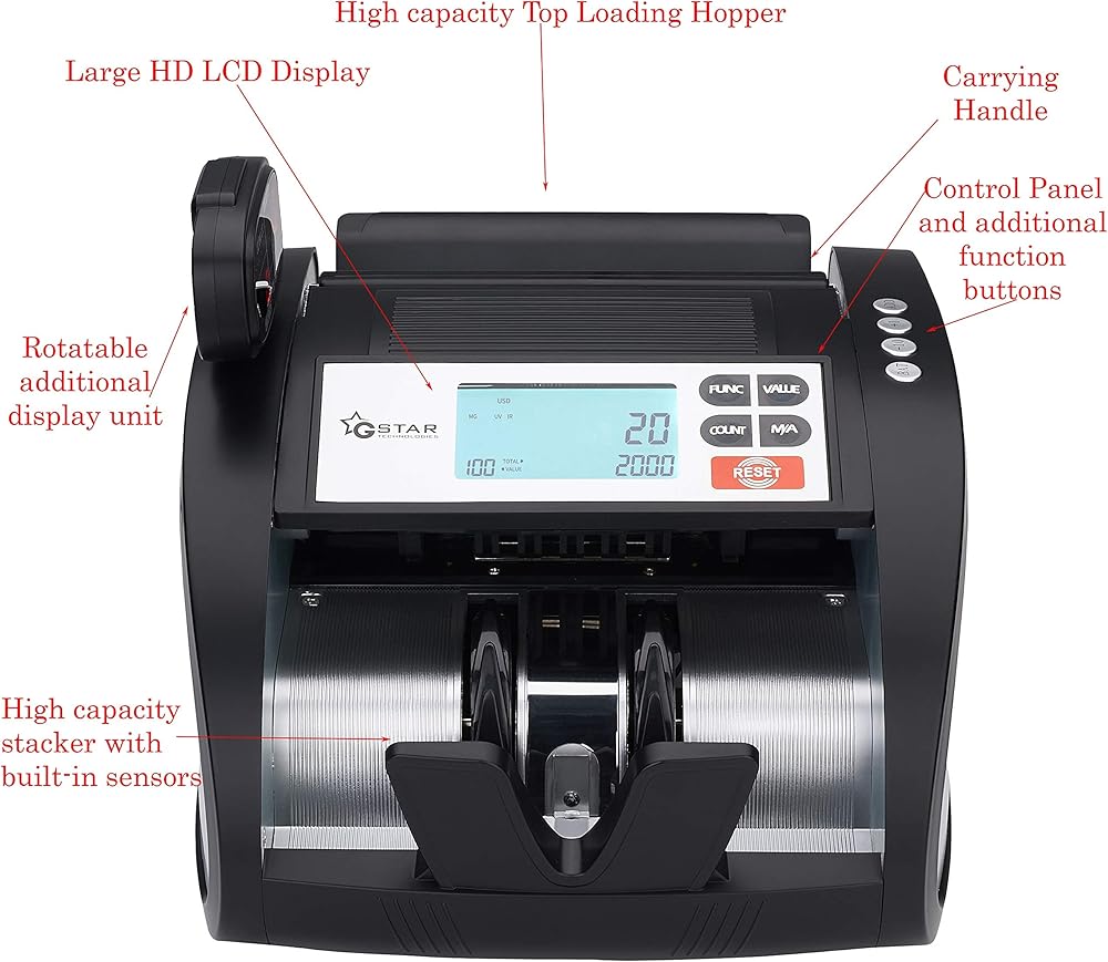 عداد النقود GStar مع بطارية ليثيوم أيون قابلة لإعادة الشحن وكشف الفواتير المزيفة بالأشعة فوق البنفسجية/MG/IR بالإضافة إلى شاشات خارجية مع وظيفة عد القيمة الإجمالية، علامة تجارية أمريكية