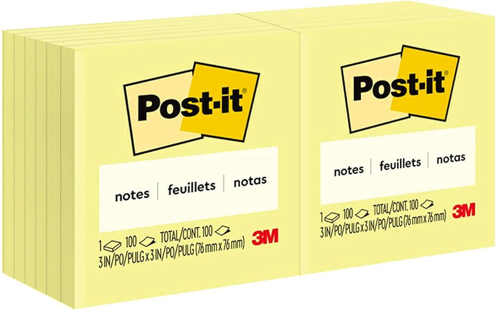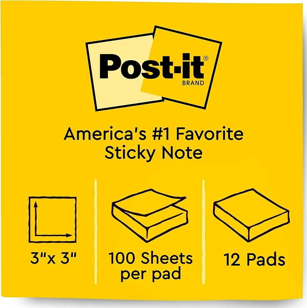 Post-it Notes stick securely and remove cleanly, featuring a unique adhesive designed for use on paper. 3 in. x 3 in. size is great to call out important information or leave notes in calendars or planners. Canary Yellow color helps your note break through. Post-it Notes are recyclable, and the paper in Post-it Notes is sourced from certified, renewable and responsibly managed forests. 100 Sheets/Pad. 12 Pads/Pack.