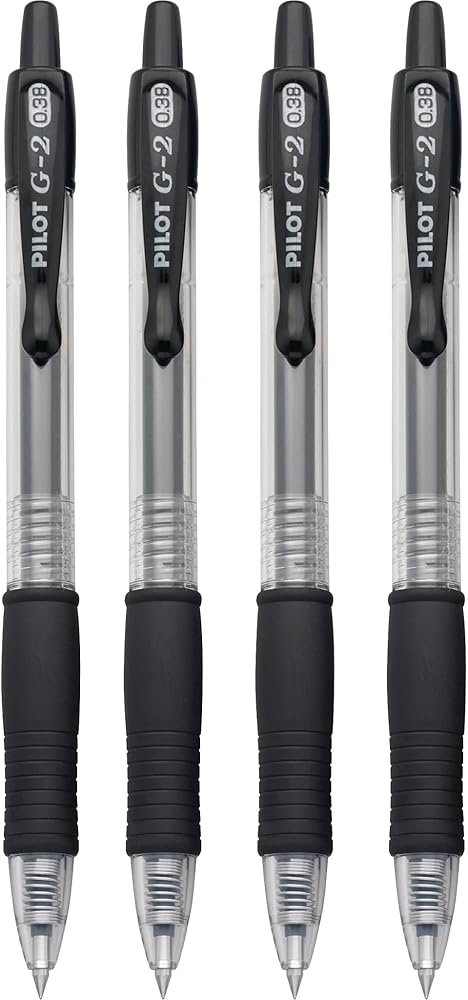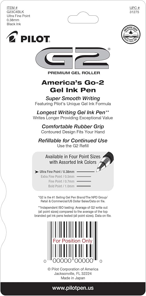 From taking notes to journaling or drawing, G2 Gel Roller pens keep the ink and your ideas flowing. These long-lasting pens come in many color options and 4 tip sizes, so it's easy to find one that caters to your writing needs and personal style. The quick-drying ink prevents smears and smudges, ensuring your work is neat and clear. Create masterpieces of writing or art with these smooth-flowing gel pens that deliver vivid and clear lines. Thanks to the comfortable rubber grip, you can tackle lengthy writing projects with ease. The 0.38 mm pen point size offers finer strokes, helping you create intricate details, write in smaller spaces, and achieve a higher level of accuracy. Archival-safe and acid-free black ink is formulated to be long-lasting and fade-resistant, ensuring your documents last for a long time. Pilot's G2 line blends smooth writing with long-lasting ink, precision and comfort for an exceptional writing experience.