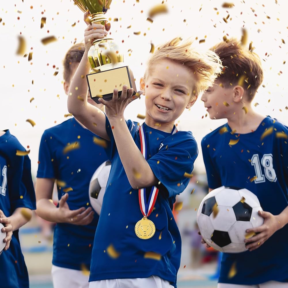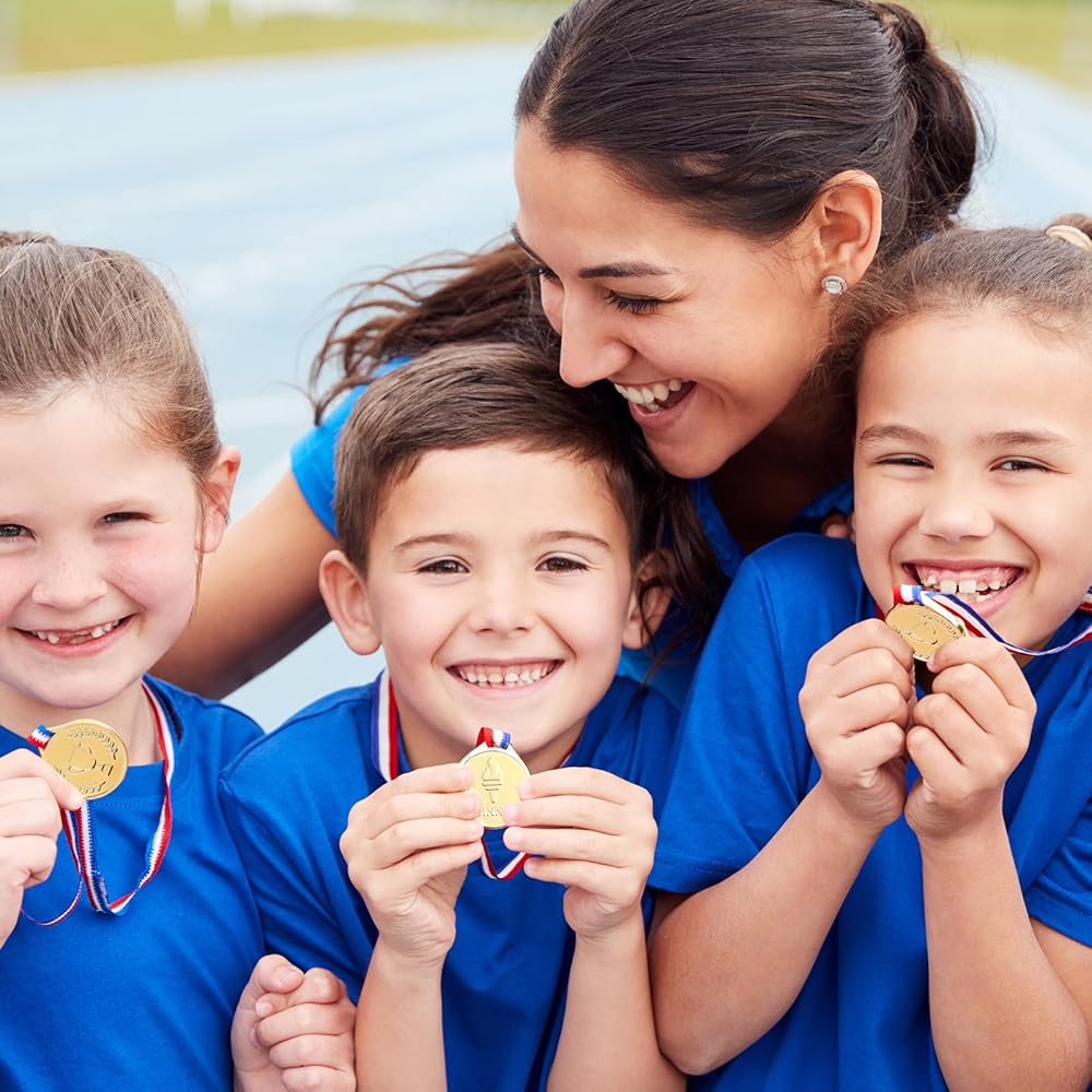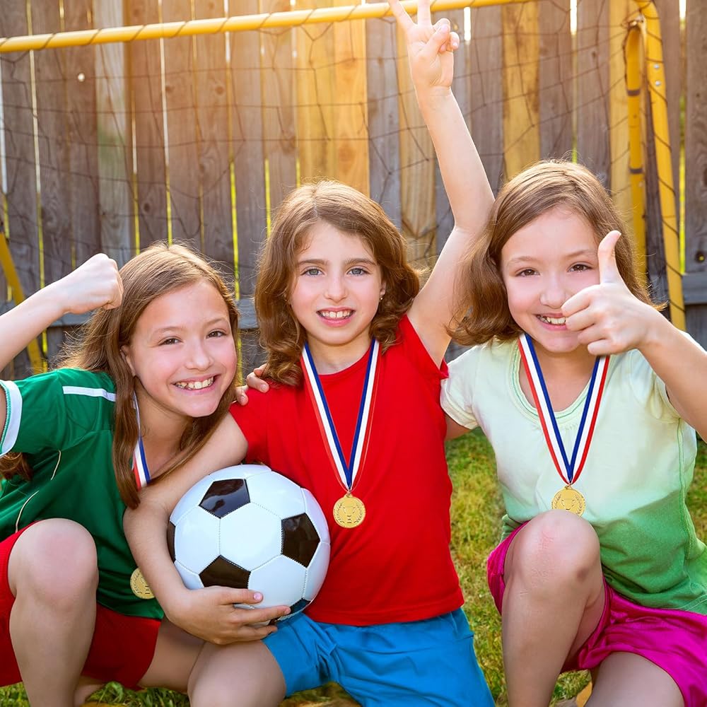 القائمة المستلمة: تحتوي كل عبوة على 24 ميدالية ذهبية للأطفال، كل منها بطول شريط يبلغ حوالي 11.02 بوصة/28 سم. يبلغ قطر الميدالية حوالي 1.38 بوصة/3.5 سم