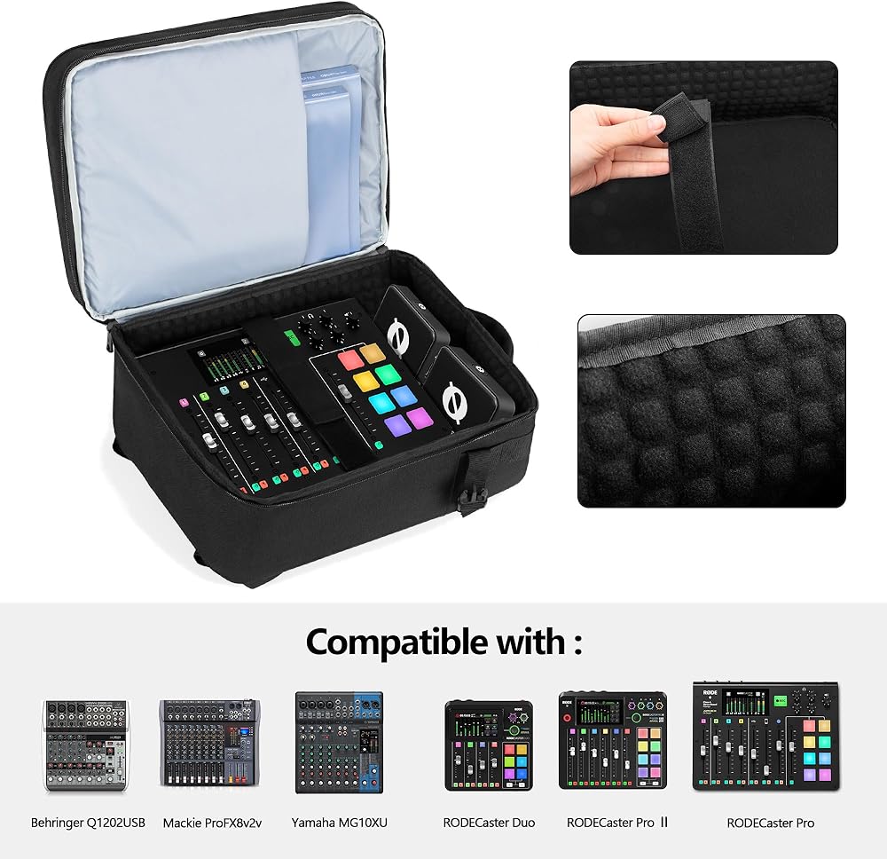 MIXER STORAGE SECTION: With a strap can hold the sound mixer smaller than 15"x11"x5" (Fits for Behringer Q1202USB, Mackie ProFX8v2, Yamaha MG10XU, RODECaster Pro, RODECaster Pro II, RC Duo. Other model please refer to the dimensions). In addition, there is a padded pocket for keeping documents or instructions (size less than 15"x11"x1").