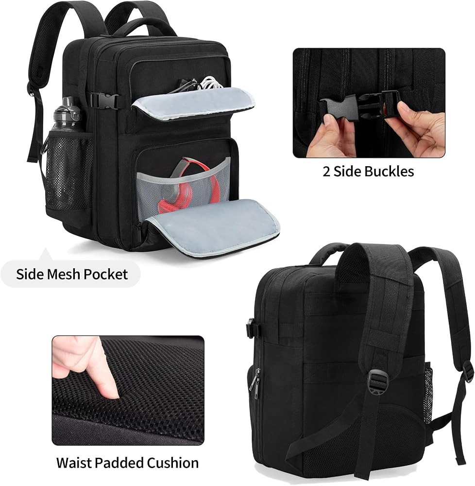 OTHER DETAILS: 2 exterior zipper pockets can store some personal items. 1 side mesh pocket for water bottle or umbrella. 2 side buckles help tighten the bag.