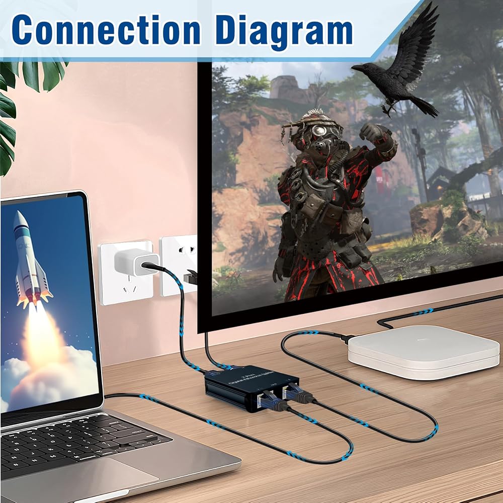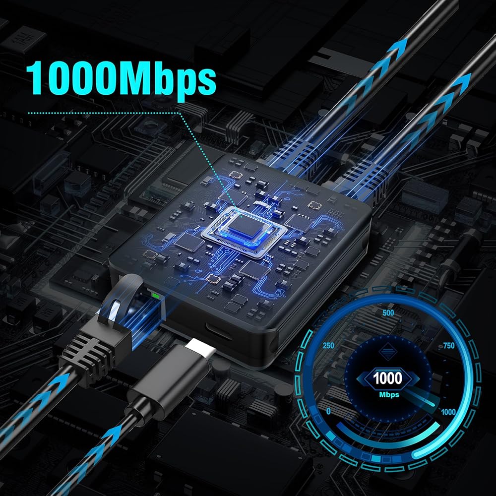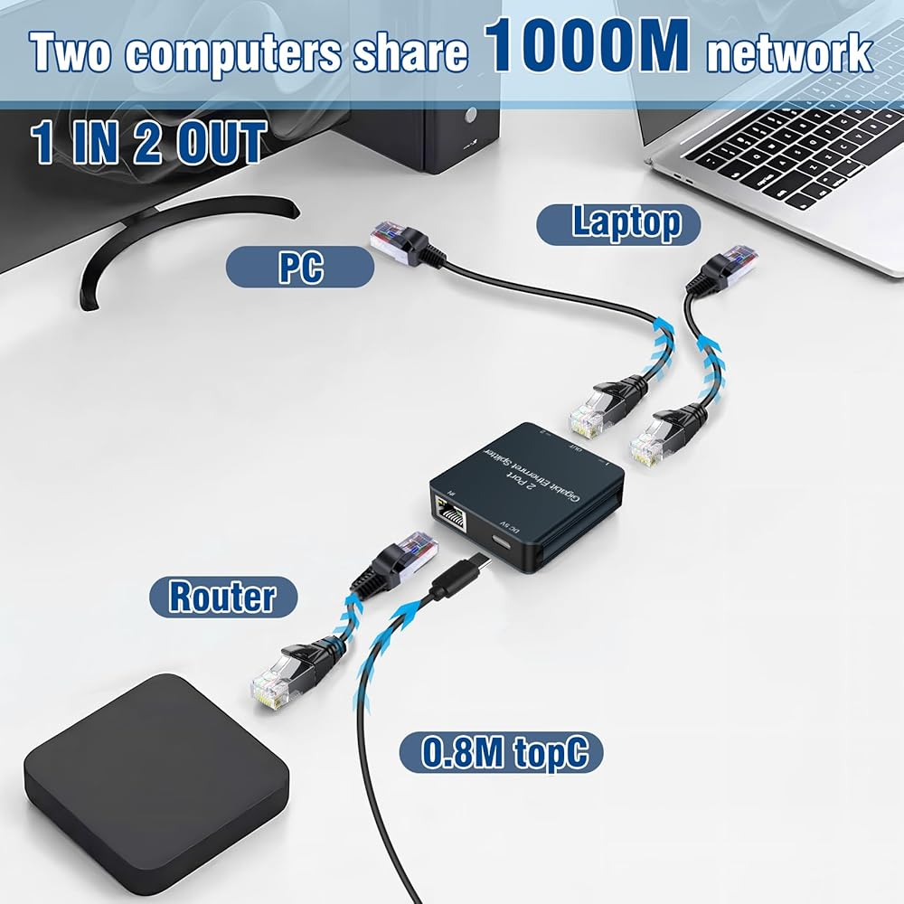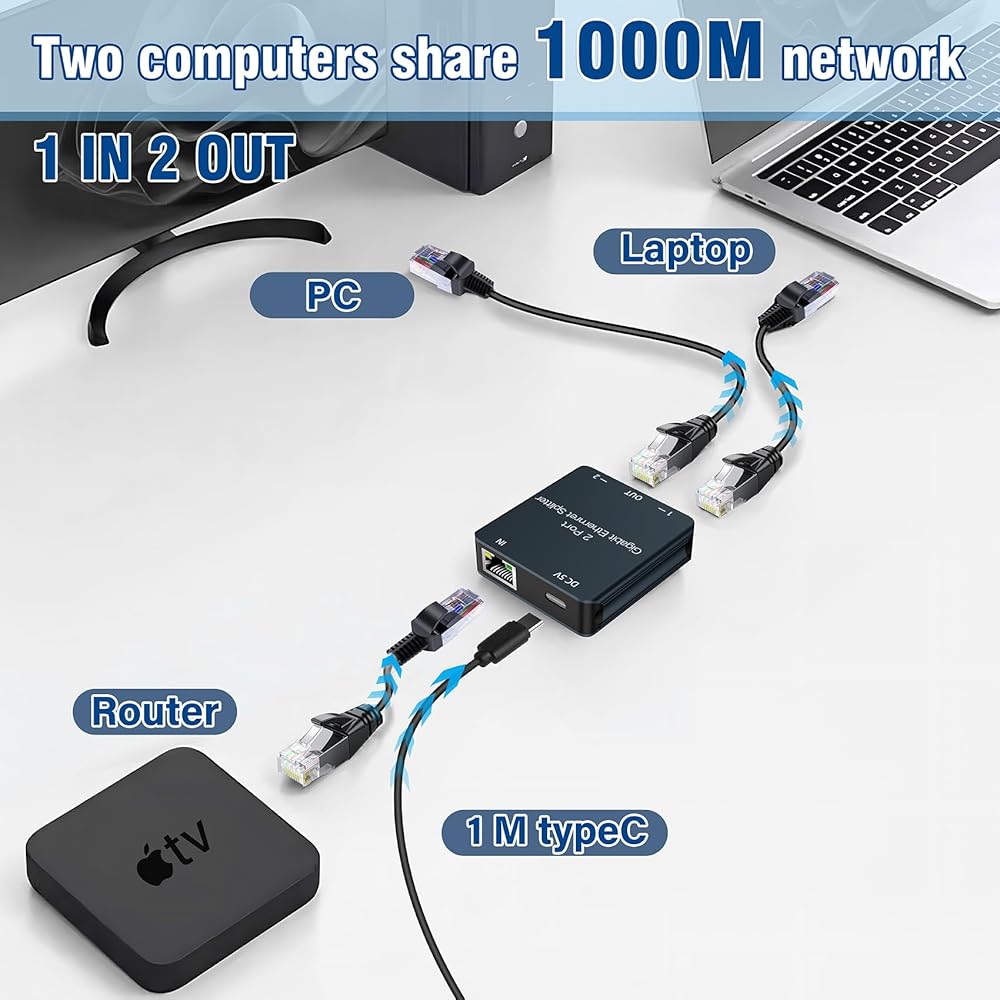موزع إيثرنت من 1 إلى 2 منافذ: يتيح لك موزع جيجابت إيثرنت المزود بمدخل واحد ومنفذي إخراج، توصيل جهازين في وقت واحد باتصال شبكة واحد، مما يجعله مثاليًا للحالات التي تحتاج فيها إلى منافذ شبكة إضافية