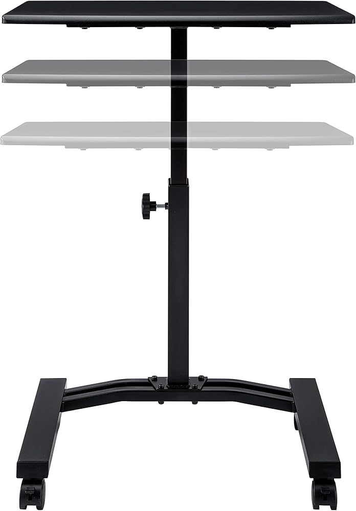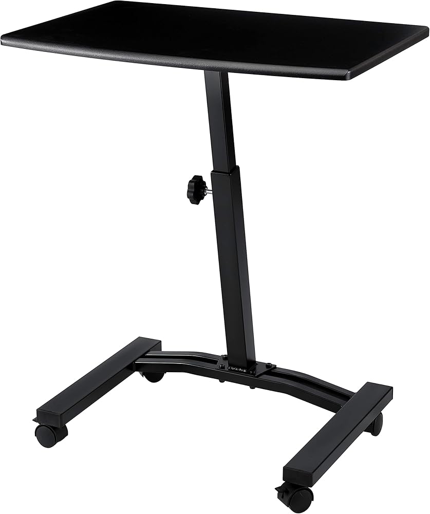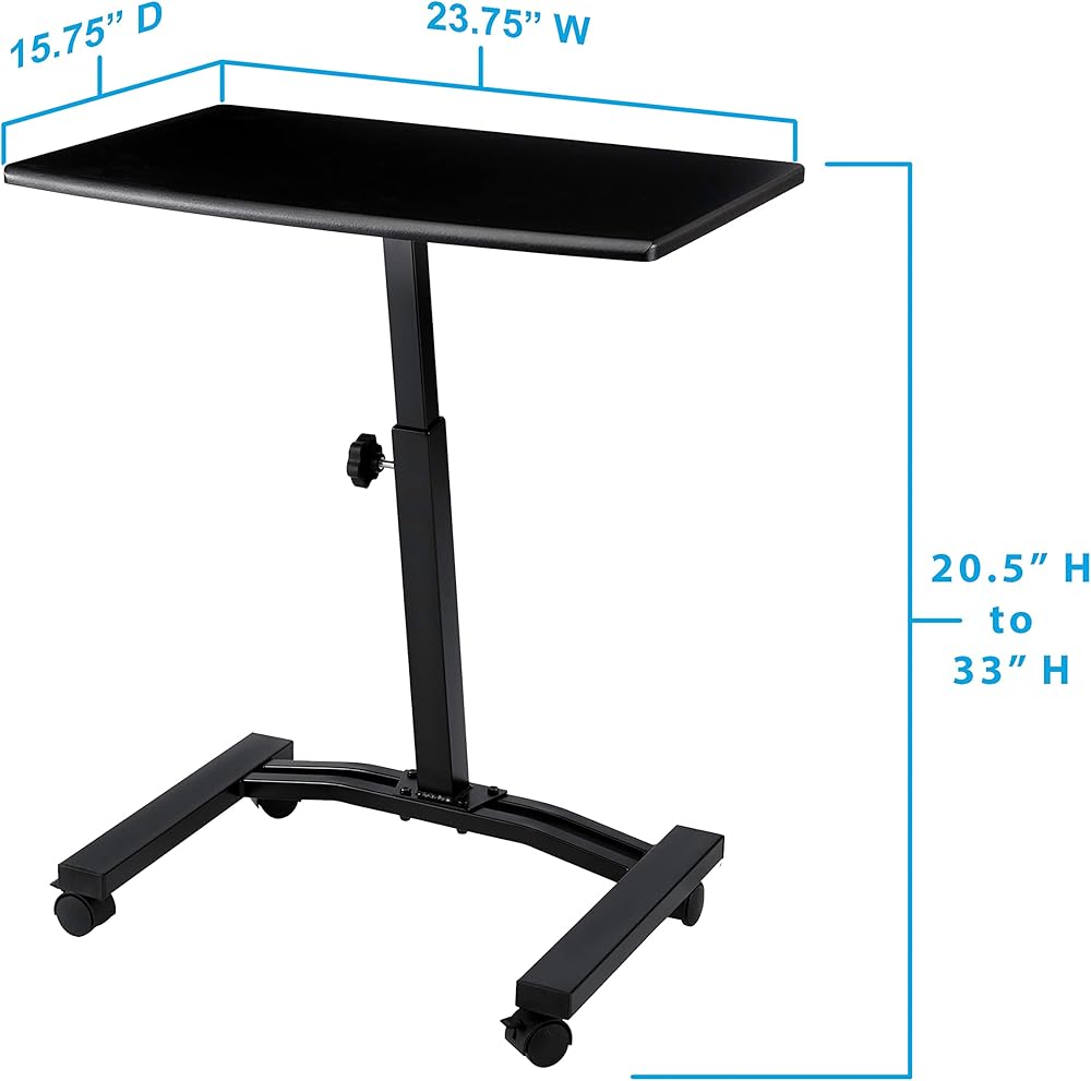 Work the way you want with Seville Classics' Mobile Laptop Computer Desk Cart. Designed with mobility in mind, the cart features four smooth-gliding, 1. 5 inch casters so you can take your work with you; two lock so the desk stays where you leave it. Easily move your laptop or writing workstation to any space in your home, dorm, or office. Manually adjust the desk's height and keep it there with the locking knob. Desk features a steel frame for stability, durability, and strength. Install the four 1. 5 inch casters to enjoy the freedom of a mobile desk that goes where you do. Base stands 2. 25" with wheels. * Four 1. 5-inch casters (2 locking) allow your work to travel with you anywhere in the office or at home * Height-adjustable surface allows the desk to be used while sitting * Low-profile, rectangular metal base allows easy use near other furniture * Welded metal construction ensures the cart is sturdy, but lightweight * Easy assembly with no drilling required * Dimensions: 24" W x 16" D x (20.5" to 33" H) * Adjustment Type: Manual * Weight Capacity: 15 lbs. * Weight: 11 lbs. * Model #: OFF65994B