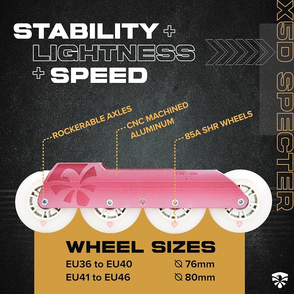 Frame: CNC aluminum frame with rockerable axles Wheels: 88A RX Wings Bearings: Flying Eagle ABEC-7