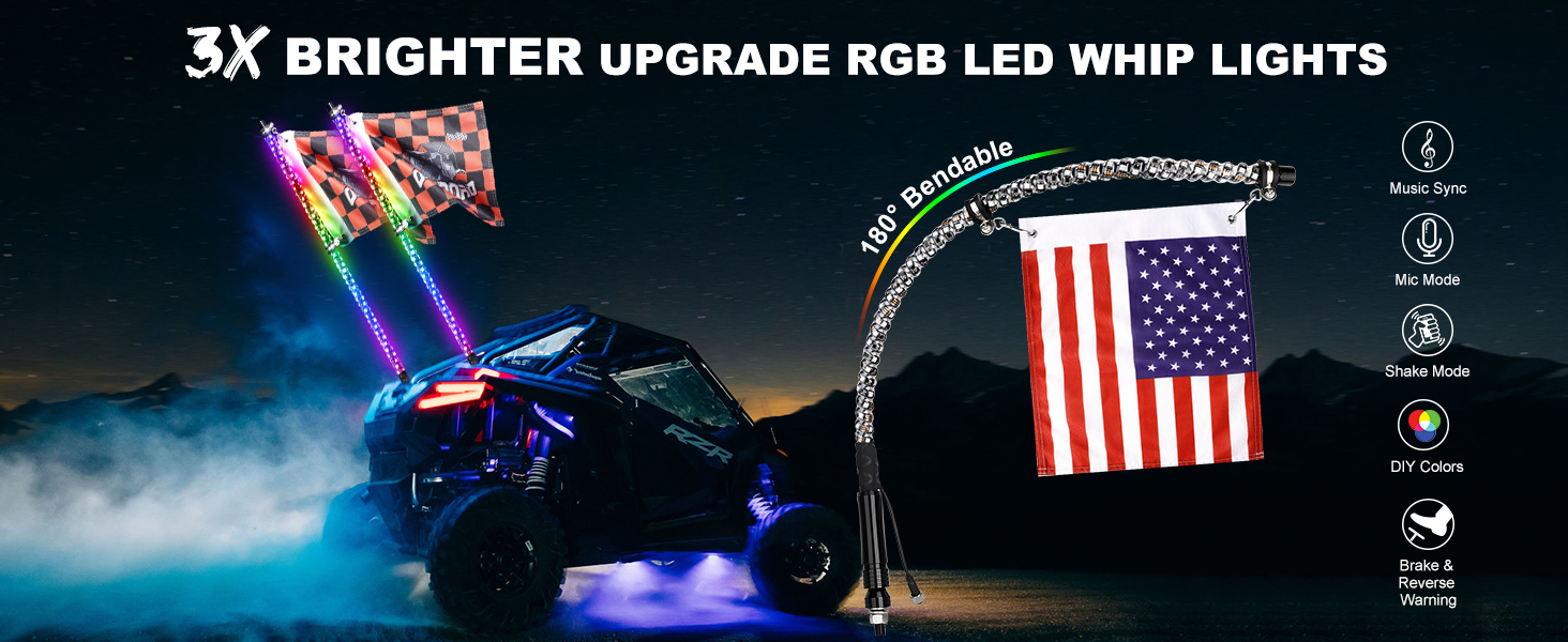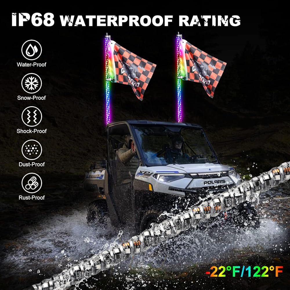 • ⚡【320 قطعة 3X شرائح ترقية أكثر سطوعًا】تم تصميم مصابيح LED الجديدة المطورة هذه لـ UTV ATV خصيصًا لاحتياجات الطرق الوعرة والمغامرين! يعتمد على رقائق 5050 RGB LED من الجيل الثاني، ويتم زيادة السطوع والرؤية بمقدار 3 مرات. وتتمتع بأشد التقلبات، مما يمنحها المزيد من مصابيح LED لكل قدم مربع أكثر من أي سوط آخر بطول 3 أقدام.