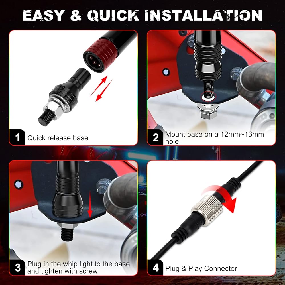 • ⚡【مطاردة حلزونية 360 درجة وقابلة للانحناء 180 درجة】يسمح لك تصميم حلزوني 360 درجة RGB Chasing Light برؤية اللون الكامل الأكثر سطوعًا ووضوحًا من كل زاوية. مصابيح سوط utv هذه مصنوعة من مادة البولي كربونات المعززة، ويمكن أن تنحني حتى 180 درجة، وهي مرنة ومقاومة للصدمات بما فيه الكفاية دون مشاكل الكسر أو الارتداد، من أجل متانة ممتازة للاستخدام على الطرق الوعرة.
