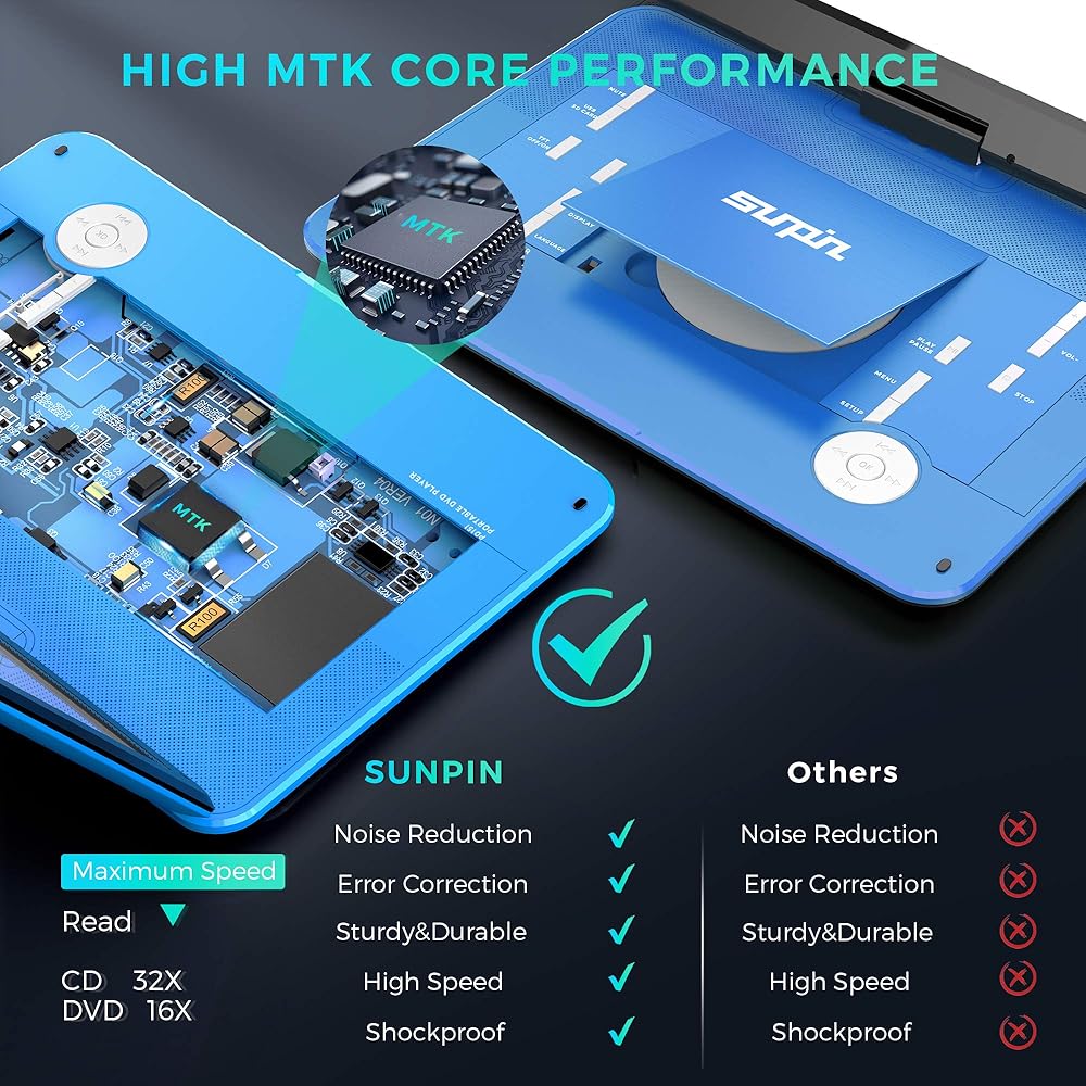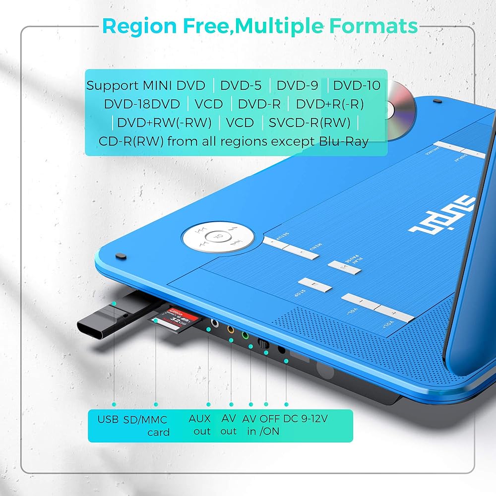 🏆خالي من المناطق، تنسيقات متعددة ---مشغل DVD المحمول SUNPIN يدعم CD، DVD، DVD-5،DVD-9،DVD-10،DVD-18، DVD+R(-R)، DVD+RW(-RW) وVCD وSVCD-R(RW) وCD-R(RW) من جميع المناطق باستثناء Blu-ray ومتوافق مع ملفات الوسائط المتعددة عبر USB وبطاقة SD (MAXFAT32GB)، مثل VOB وAVI وMPEG1 وMP3 وWMA ، جى بي إي جي.