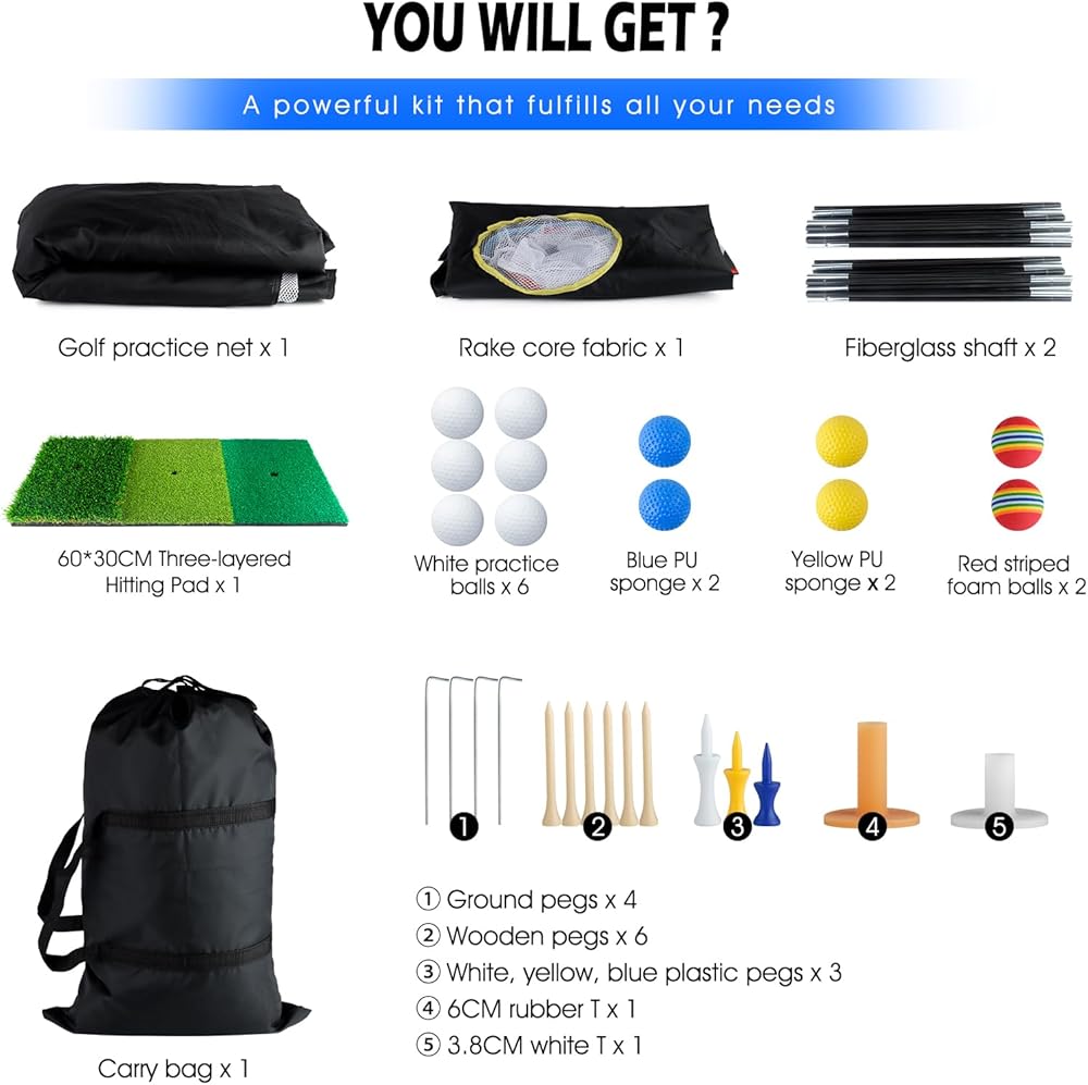 【محمول وسهل التركيب】 يمكن تركيب شبكة وحصيرة تدريب الجولف الخاصة بنا بسهولة وإزالتها في غضون 2-5 دقائق. نحن نقدم دليل التثبيت التفصيلي والفيديو، لتحسين استخدام وقتك الشخصي الثمين. سوف تحصل على: شبكة قيادة جولف مقاس 10 × 7 × 6 أقدام (عرض/ارتفاع/عمق)؛ 1 هدف جولف مؤثر؛ 1 حصيرة جولف؛ 12 كرة تدريب للجولف؛ 9 أوتاد كرات الجولف؛ 2 المحملات المطاطية. وحقيبة حمل تتسع لجميع الملحقات. وهذا يساعد في توفير المساحة ويسهل سهولة الحمل.