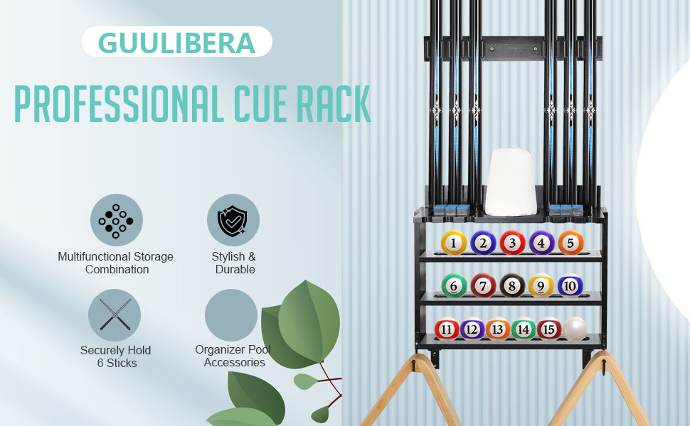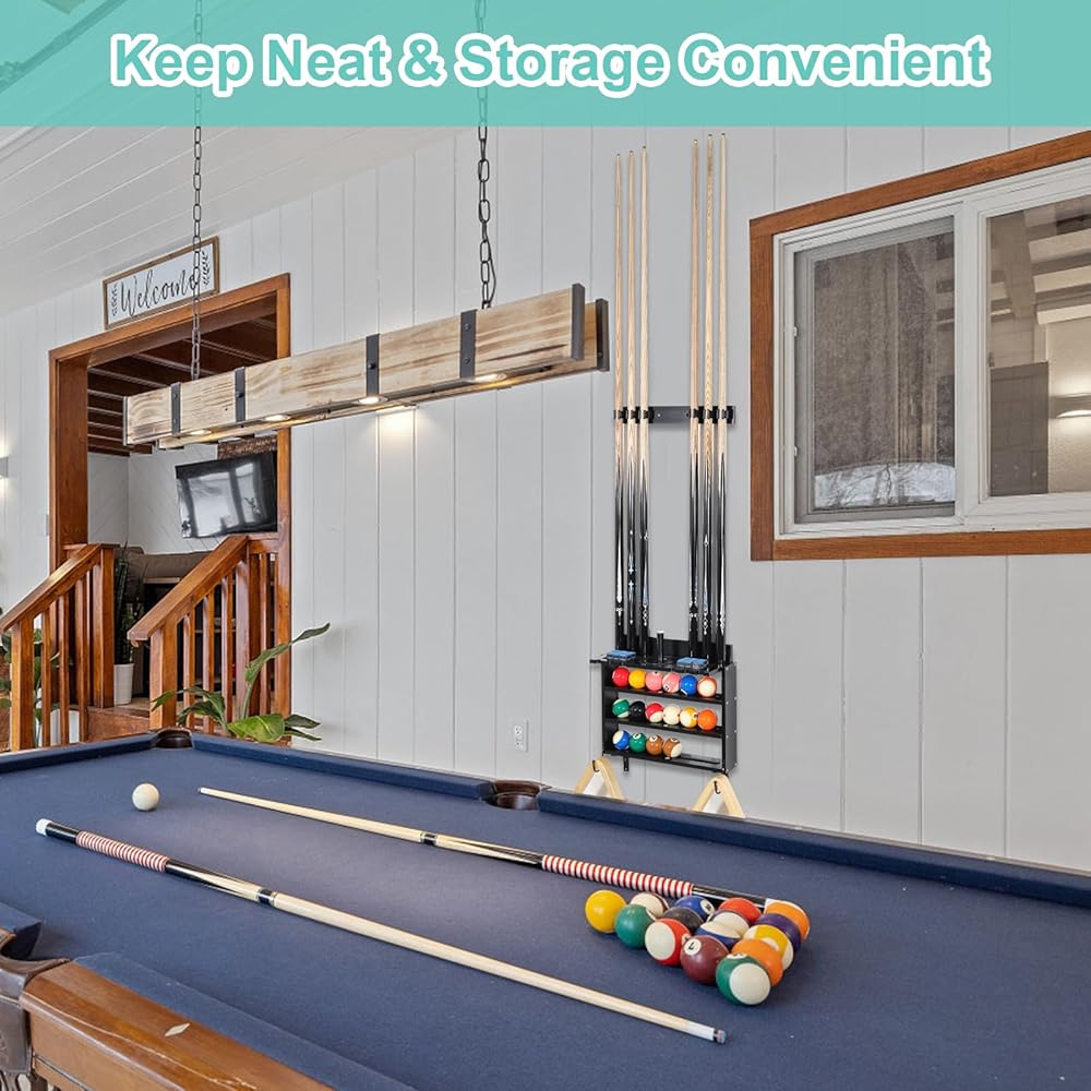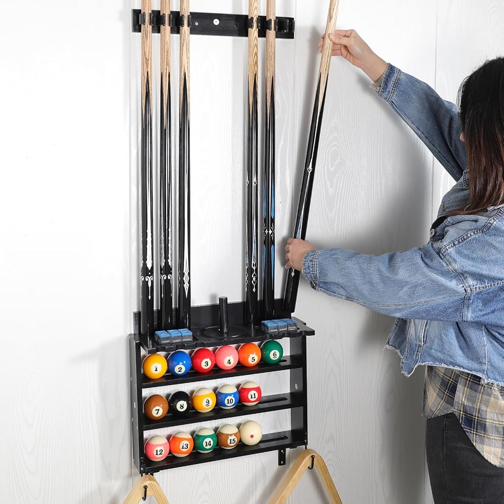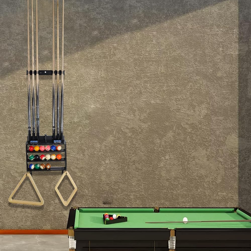 حامل عصا البلياردو من GUULIBERA، حامل عصا حمام السباحة على الحائط لـ 6 حامل عصا حمام السباحة ومجموعة كاملة من الكرات، حامل عصا البلياردو من الخشب الصلب 100%، رف عصا البلياردو لملحقات طاولة البلياردو