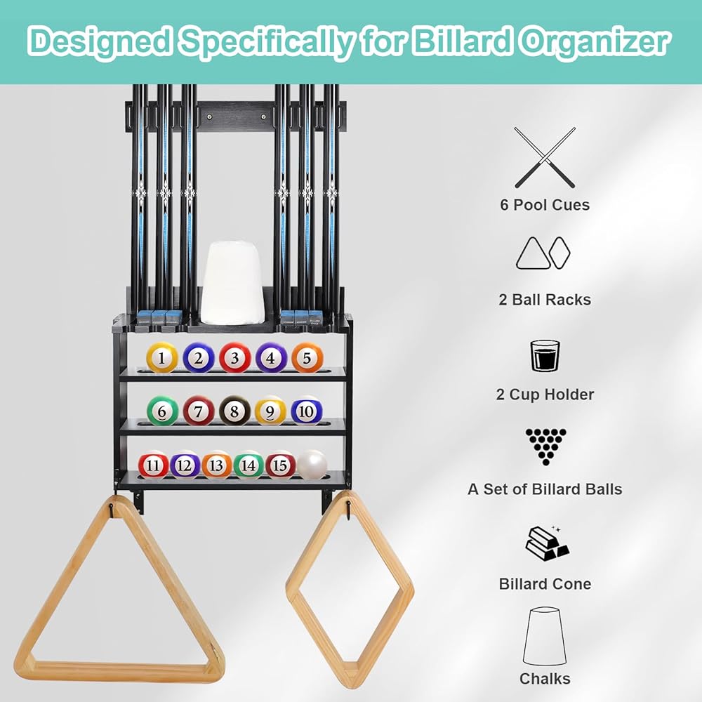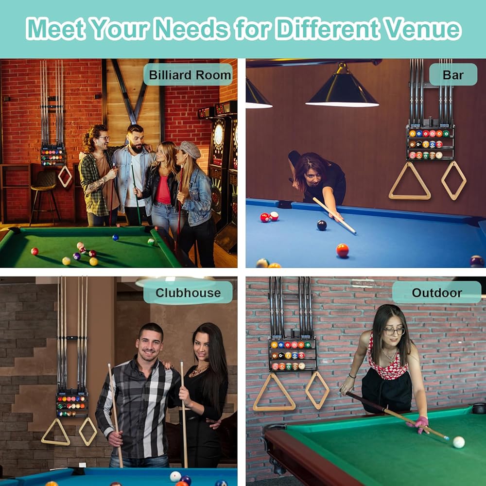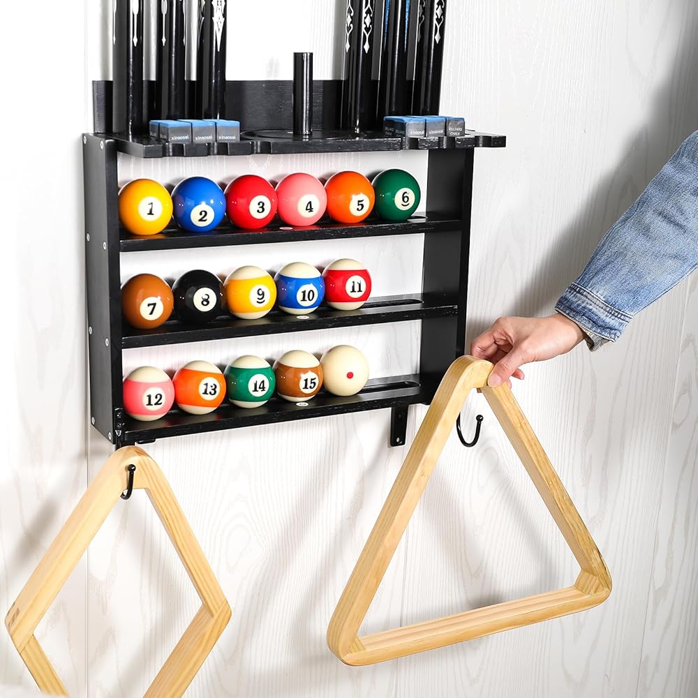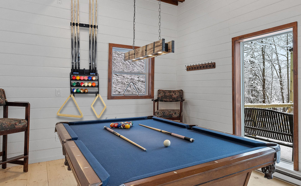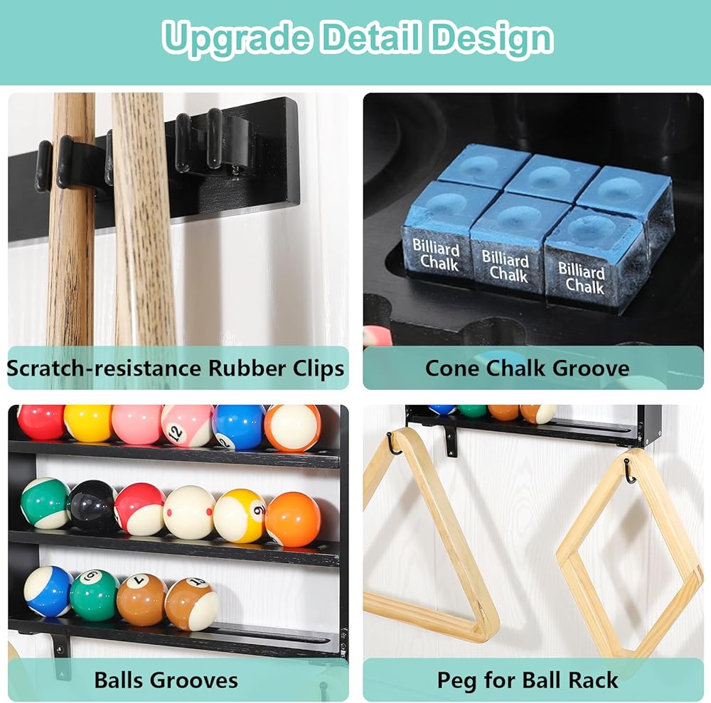• 【حامل عصا حمام السباحة】: يوفر رف عصا حمام السباحة الخاص بنا طريقة أنيقة وعملية للحفاظ على غرفة البلياردو الخاصة بك منظمة وخالية من الفوضى. يمكن أن تستوعب ما يصل إلى 6 قطع، ومجموعة كاملة من 16 كرة بلياردو، ومثلثين أو رفوف كرات البلياردو الماسية، بالإضافة إلى الطباشير والفرش.