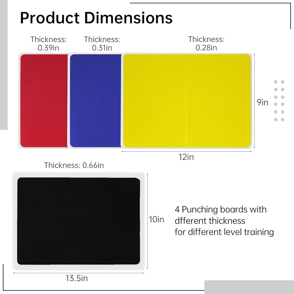 【4 مقاسات لمستويات مختلفة】 هناك 4 قطع من ألواح كسر التايكوندو بأربعة سُمك، بما في ذلك 0.28 بوصة، و0.31 بوصة، و0.39 بوصة، و0.66 بوصة، مناسبة للتمرين اليومي والمهني لمستويات المهارة المختلفة، مما سيساعدك على تحسين قوتك. والمهارة من مستوى إلى مستوى! تتوفر ألواح التثقيب الأربعة بأربعة ألوان من الأصفر والأزرق والأحمر والأسود، وتتماشى بشكل جيد مع ألوان الحزام من مختلف المستويات.