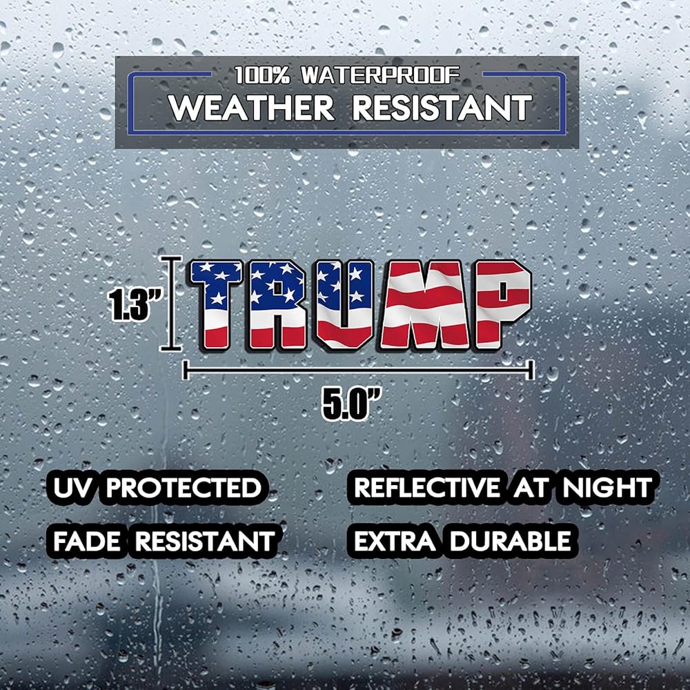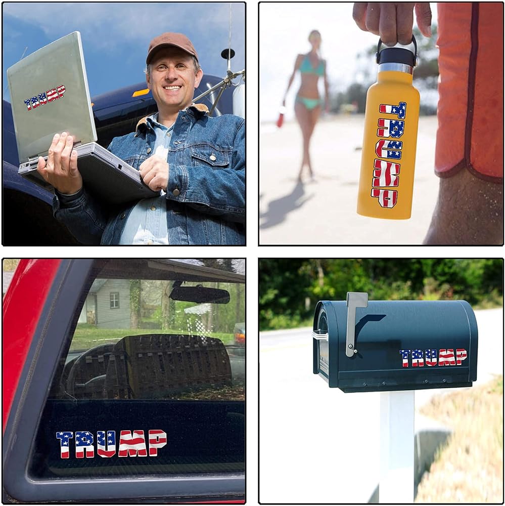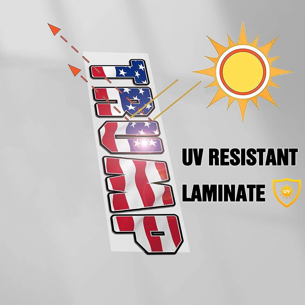 These TRUMP 2024 stickers are printed on high-quality vinyl sticker paper with weather-resistant UV coating, so the stickers have a function of sun protection, waterproof, reflective and durable, perfect for your car, truck, vehicles, window, laptop, computer, water bottle, mug, cooler, skateboards, hard hat, phone case, bike, wall or any other smooth surface!
