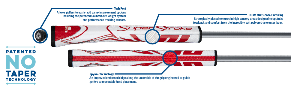 Tech-Port – Located at the top of SuperStroke grips, Tech-Port allows golfers to easily add game-improvement options including the patented CounterCore weight system and performance tracking sensors.