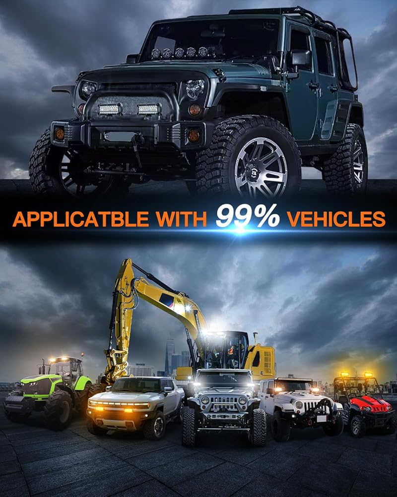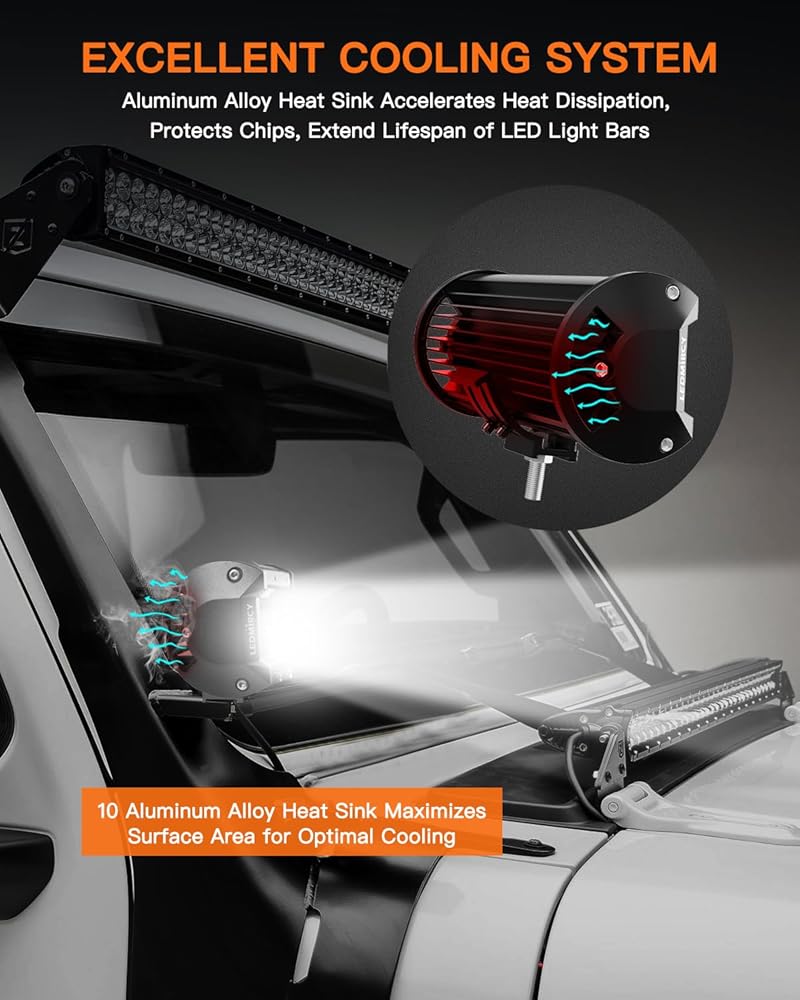 IP68 WATERPROOF & EXCELLENT COOLING SYSTEM—Metal connections of atv light bar are treated with waterproof glue, and the powerful optical components are wrapped in a metal structure that is almost impenetrable by water molecules. Whether it's rainy, foggy, or snowy days, our off road lights will remain continuously brightness. 10 aluminum alloy heat sink maximizes surface area, accelerates heat dissipation, extend LEDs lifespan.
