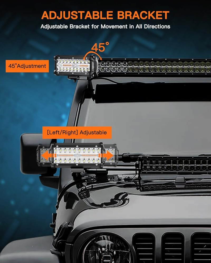 PERFECT ACCESSORY—Mount bracket of off road light bar is made of 6063 Aluminum material, which is shockproof, and very tough, problem of the mount bracket being broken will not happen to you. Mount bracket can be adjusted [up/down/left/right] according to the actual situation, easy to change the direction of the beam and the lighting distance. Plug & play wiring harnesses, come with relay and fuse play an important role in safety protection and circuit switching.