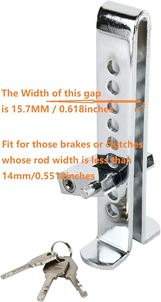 Warm Notice: this 9 Holes Brake Pedal Lock fits for those brakes or clutches whose rod width is less than 14mm / 0.5512 Inches. thank you. for details, please kindly check the images in this listing;
