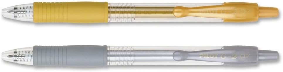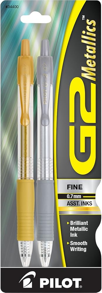 Enhance your art projects with the G2 Metallic Gel Roller pens. The quick-drying ink prevents smears and smudges, ensuring your work is neat and clear. Perfect for paper crafts, calligraphy, journaling and scrapbooking, these gel pens add elegance and visual interest to your writing or drawing. The 0.7 mm fine pen point size strikes a balance between fine and bold lines and the comfortable rubber grip offers ergonomic support, reducing hand fatigue and making lengthy writing projects a breeze. Pilot's G2 line blends smooth writing with long-lasting ink, precision and comfort for an exceptional writing experience.
