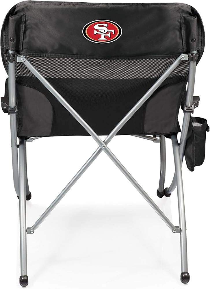 Even if you're not a linebacker, you'll enjoy the extra room of the NFL PT-XL Heavy Duty Camping Chair, an outdoor chair with an extra-wide polyester canvas-constructed seat in a durable ripstop weave. Show off your team spirit everywhere you go with this chair, adorned with your favorite team's logo across the back. This XL camp chair also features a breathable backing, padded armrests, a hanging beverage pocket, and a sturdy, powder-coated steel frame that folds inward to fit in a drawstring carrying bag with shoulder strap. This big and tall folding beach chair is the perfect place to post up for a day at the beach, camping, picnicking, or on your porch! With a high weight capacity of 400lbs, this outdoor folding chair is the heavy duty choice for secure comfort on the go.