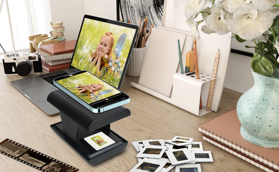 سهلة التشغيل - أدخل بطاريتين AA (غير متضمنتين)، وأدخل الشريحة أو الفيلم، وقم بتشغيل الإضاءة الخلفية LED، ثم ضع عدسة هاتفك الذكي فوق الفتحة ثم انقر للالتقاط. تعتمد جودة الصورة على دقة كاميرا هاتفك.