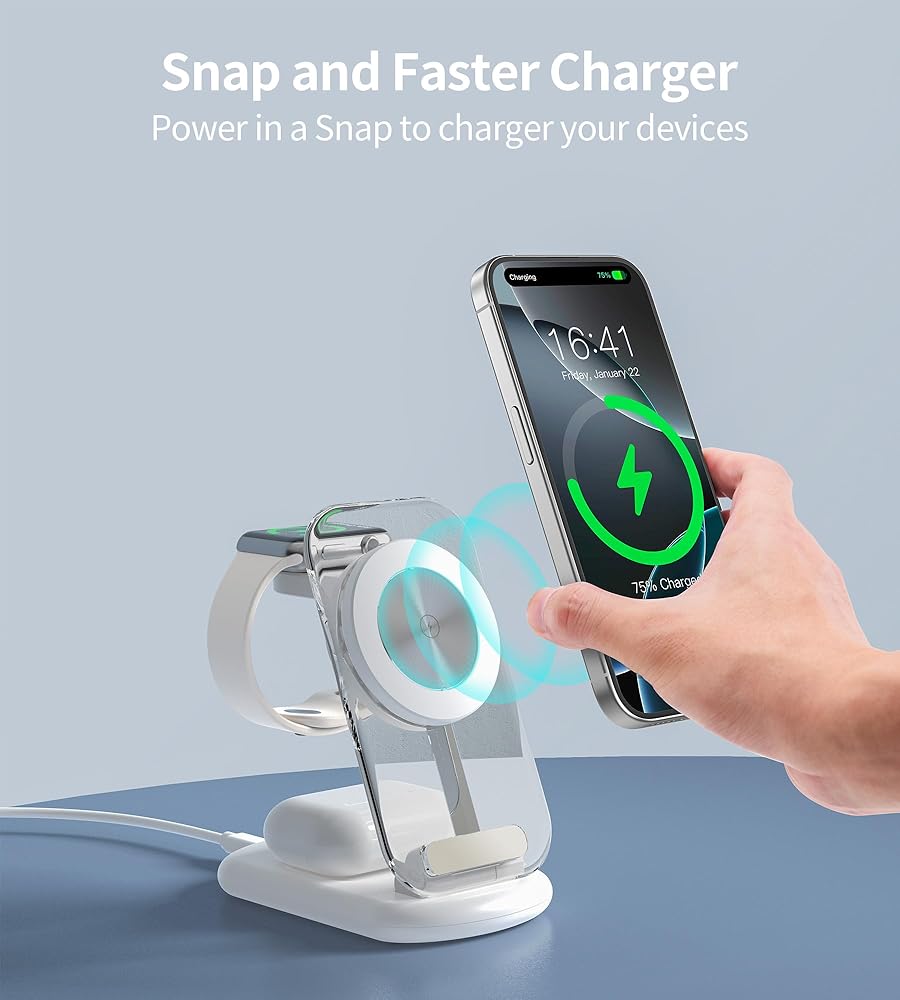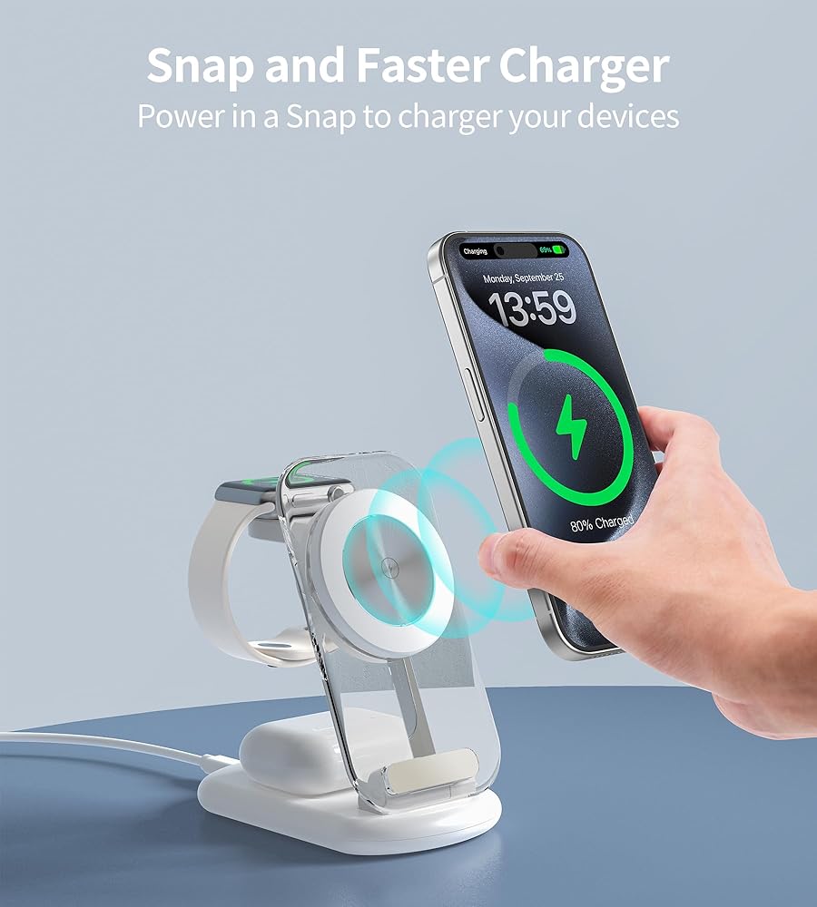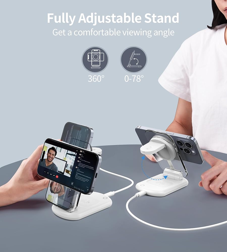 【Power in 1s Snap】: 3 in 1 foldable wireless charging station for Apple Built in with dedicated magnets, the wireless mag safe charger stand provide precise mag safe alignment for your electronic devices. Solid wireless magnetic connection ensures the convenience and security of charging and holding your devices in any orientation portrait or landscape.