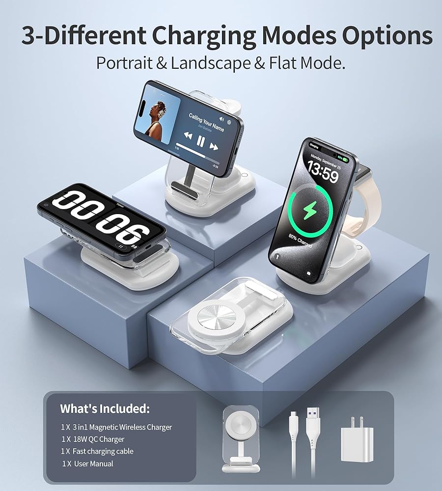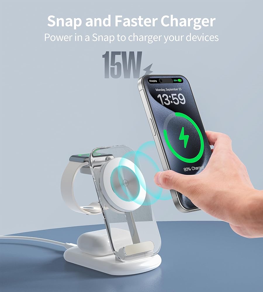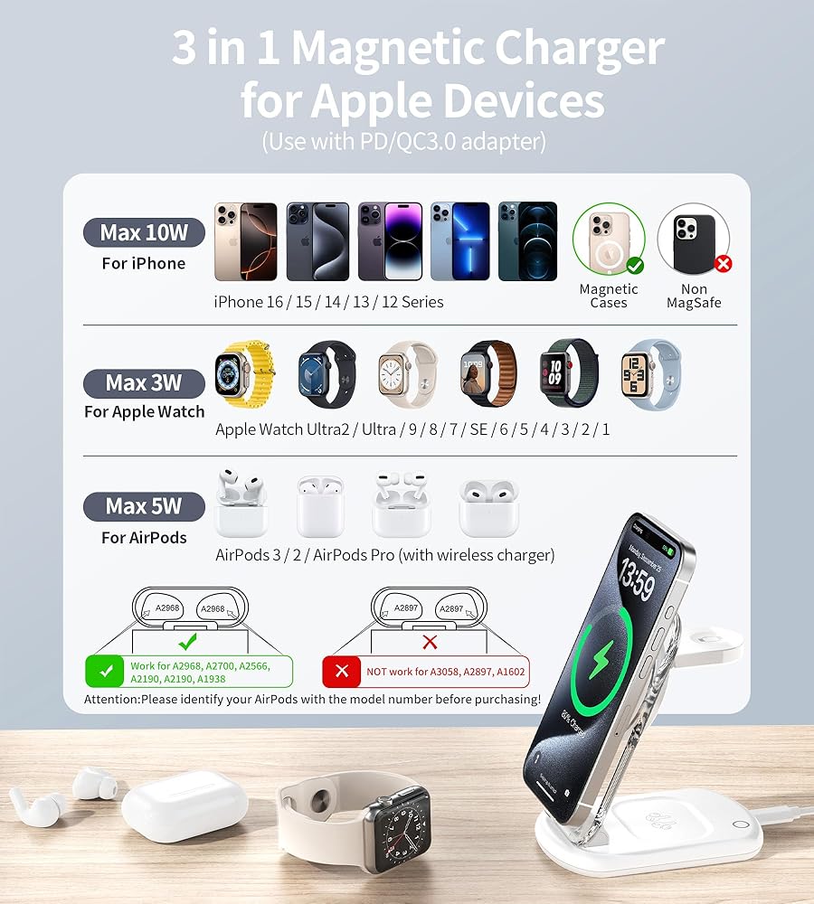 【3 in 1 Magnetic Wireless Charger】The evolved mag-safe charging station support charging iPhone, iwatch, AirPods simultaneously. Helping you end the messy cord life and tidy your desktop. The magnetic suction is suitable for iPhone 15/15 Pro/15 Plus/15 Pro Max/14/14 Pro/14 Plus/14 Pro Max/13/13 Pro/13 Pro Max/12/12 Pro/12 Pro Max. It is also compatible with Apple Watch 9 8 7 6 5 4 3 2 Ultra 2 1 & AirPods pro 3 2. (NOTE: Please take off your phone case when charging, or use a magnetic phone case.)
