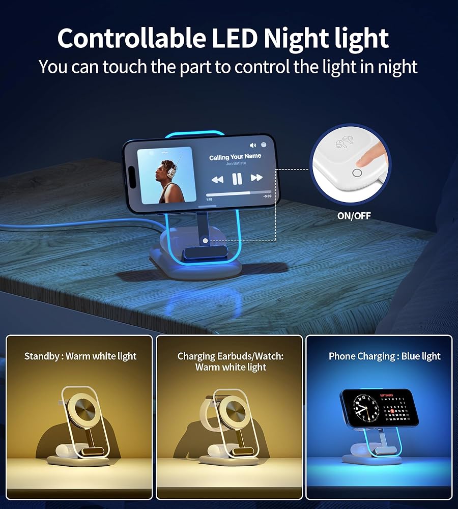 【Adjustable Touch Control Nightlight】Our upgraded multi-functional charging station for Apple devices charger stand is not just for charging your devices - it also offers adjustable ambient lighting. The warm light can be used as night light when power on or in standby mode. Fully charged or Charging indication:Phone-Blue light always on. Charging indication: Phone-Blue light always on; Earbuds,Watch-no light. Plus, You can touch the switch to control the light in night, making it perfect for bedside use without disturbing your sleep. Perfect for study, bedroom, and nightstand decorations.