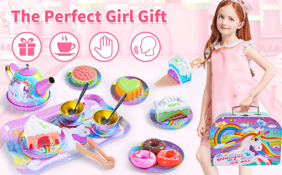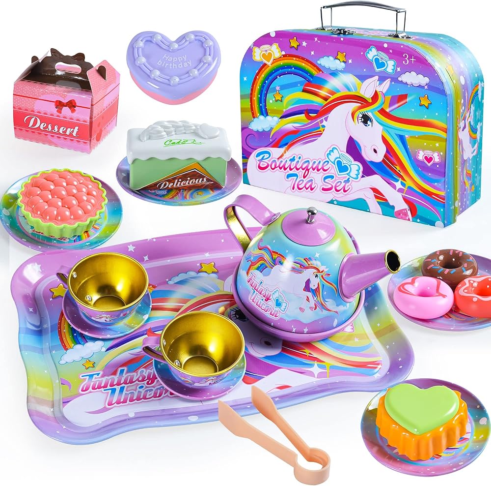 【Packaging that children will love】The carry case for this tea set is specially designed as a childhood toy for children. The pattern is rich, with unicorns, rainbow stars and hearts. Colourful. The tea set carry case is easy for parents to store and organise and carries a fixed handle on top, making it easy for children to carry around when they go out to play