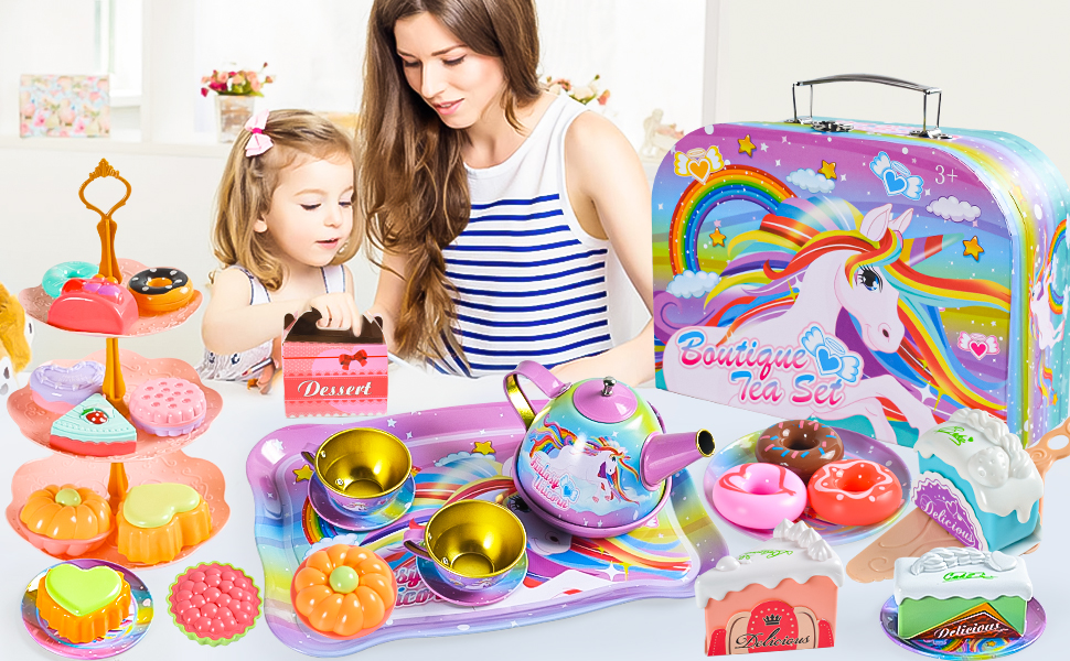 【36 pcs kids' afternoon tea set】Cute unicorn carry case.It contains a teapot with lid exclusive beast, 4 teacups, 4 tea stacks, 4 plates, matching spoons, 1 dessert holder, 4 cakes, 5 doughnuts, 6 dessert accessories, cake tower (3 tiers), small gift box. A realistic afternoon tea set to give children an enjoyable afternoon tea time