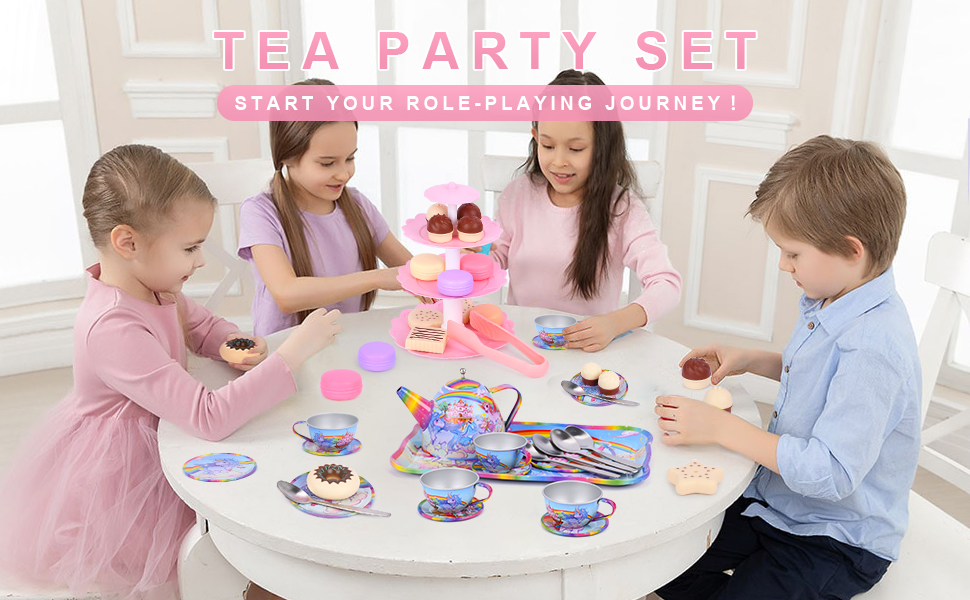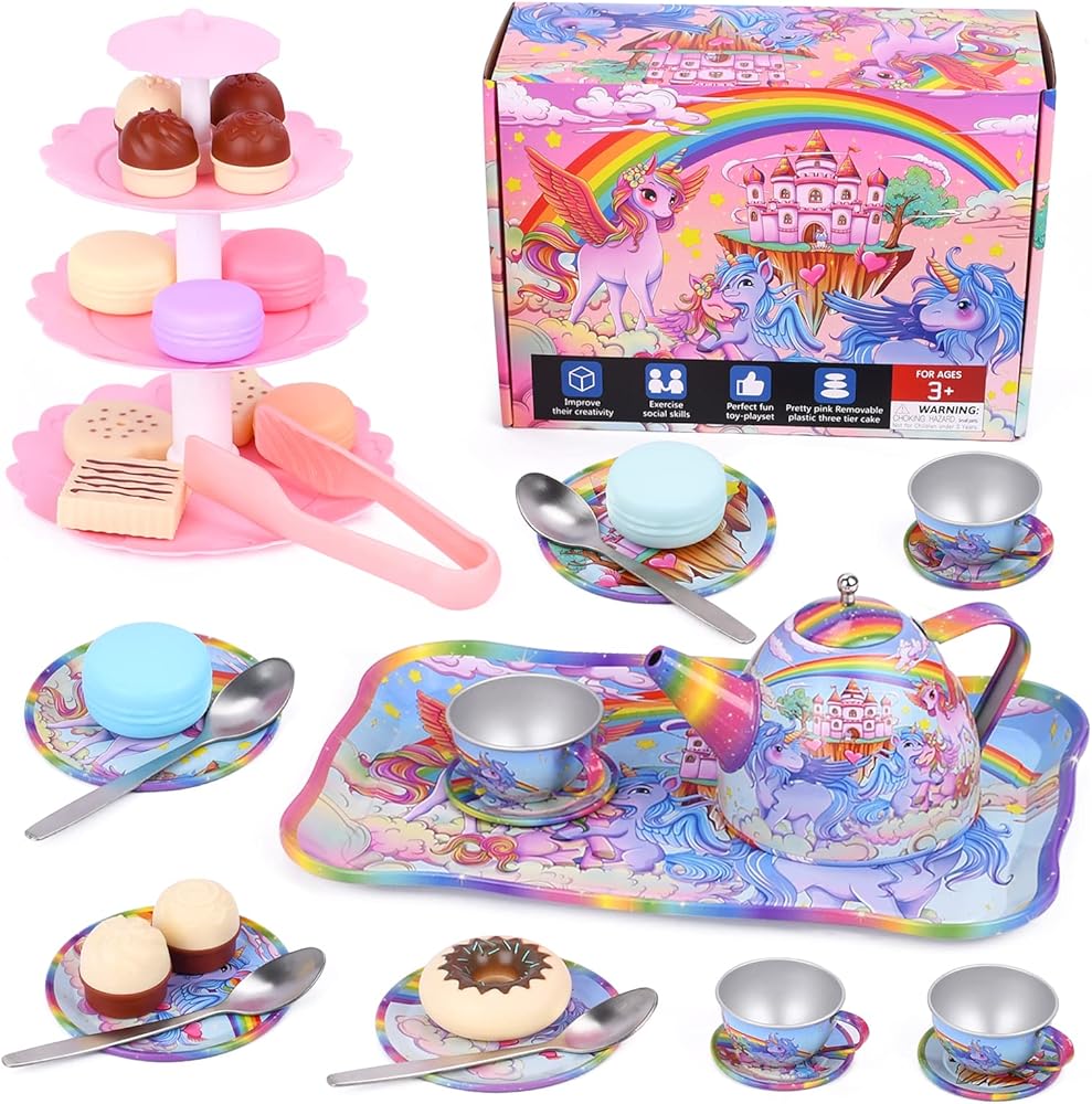 FUCNEN مجموعة الشاي للفتيات الصغيرات حفلة التظاهر اللعب الحلوى والشاي بعد الظهر مجموعة ألعاب صغيرة للفتيات / الأطفال الصغار / الأطفال الذين تتراوح أعمارهم بين 3 4 5 6 7 8 هدية حفلة الشاي كوب الشاي يونيكورن مجموعة لعيد ميلاد أو مهرجان