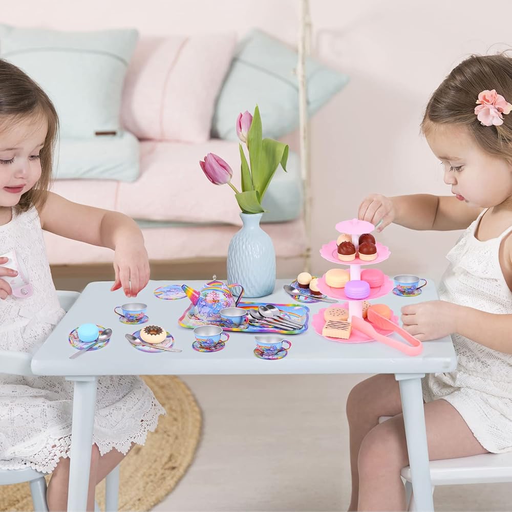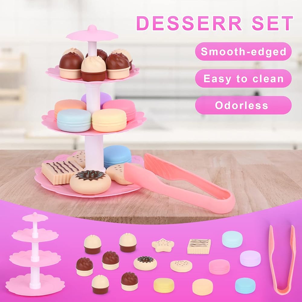 【ACOMPLETE TEA PARTY SET FOR LITTLE GIRLS】 : Dessert and tea set include: 1 x teapot, 1 x tea tray, 4 x cups with base, 4 x dishes, 4 x spoon, 1 x food tong, 1 x 2-tier cake stand, 4 x plastic biscuits, 6 x plastic cupcakes, 6 x plastic macaroons.
