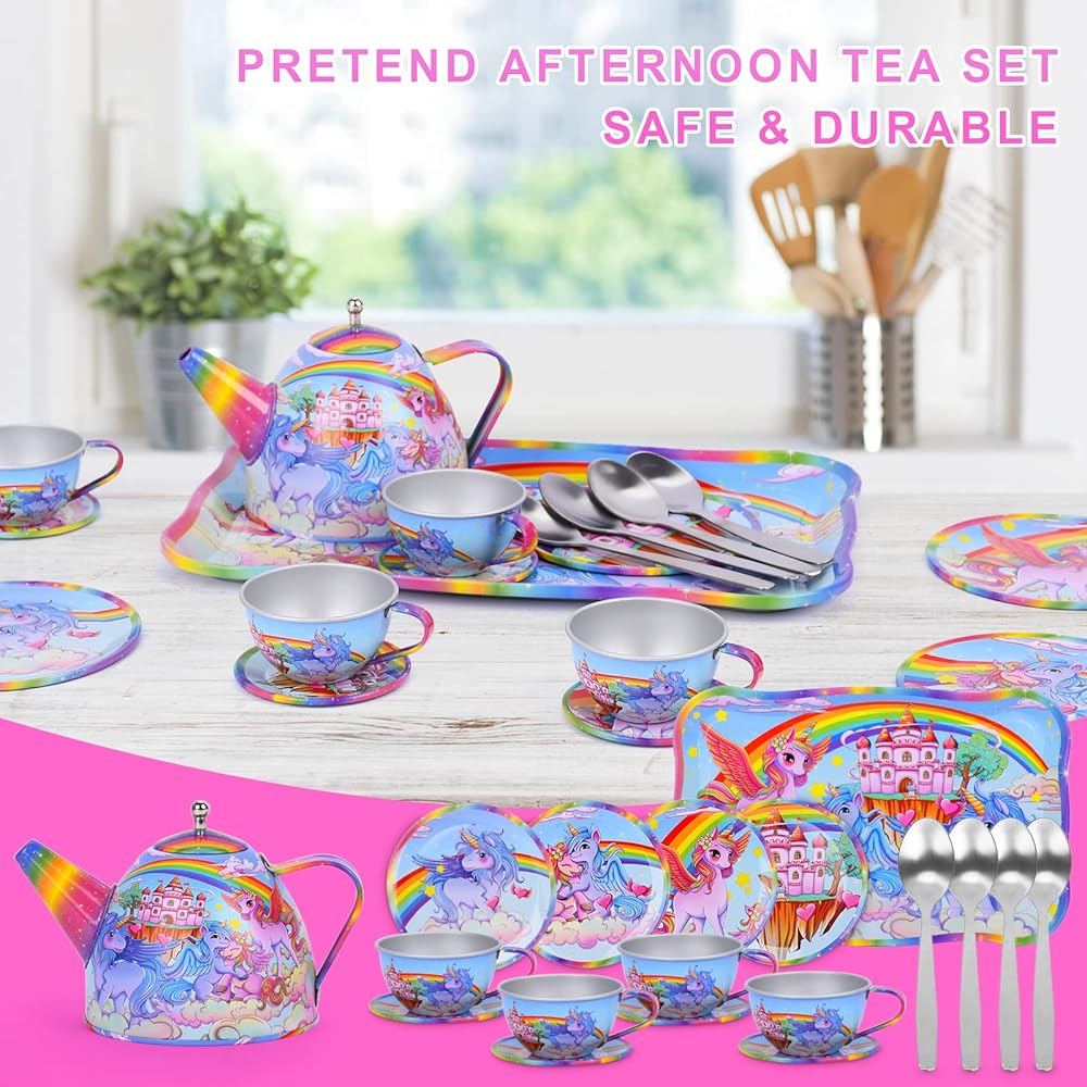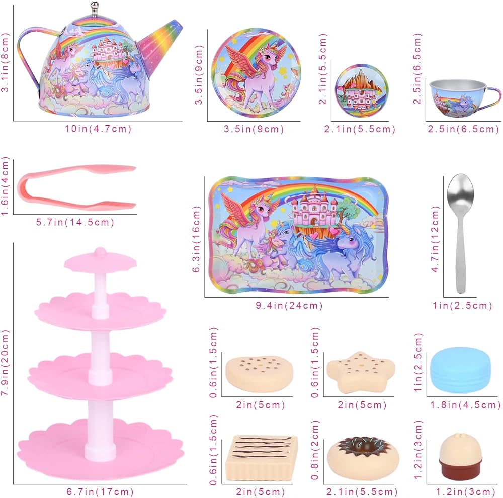 【SAFE AND DURABLE PRETEND AFTERNOON TEA SET】: This kid's tea set is made of non-toxic tin-coated iron material, dessert set is made of high quality ABS plastic, odorless, and smooth-edged, also easy to clean. It is a really safe and durable toy food set each baby girl deserves to have. with the distinctive Unicorn pattern sending out peaceful afternoon tea.
