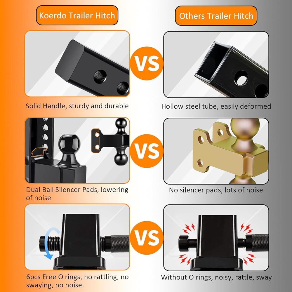 【بدون تشغيل، بدون تأرجح، قياسات مطورة بدون خشخشة 】① 3 وسادات كاتم صوت و8 حلقات O لتقليل الصوت بين الساق والمستقبل ②غسالات مطاطية بين جزء التوصيل من الكرة والقناة لتقليل الضوضاء ومنع التذبذب. كل هذه الأمور تساعد في تقليل الضوضاء التي قد تحدثها المقطورة. استمتع برحلتك الجميلة الهادئة!