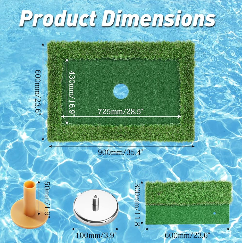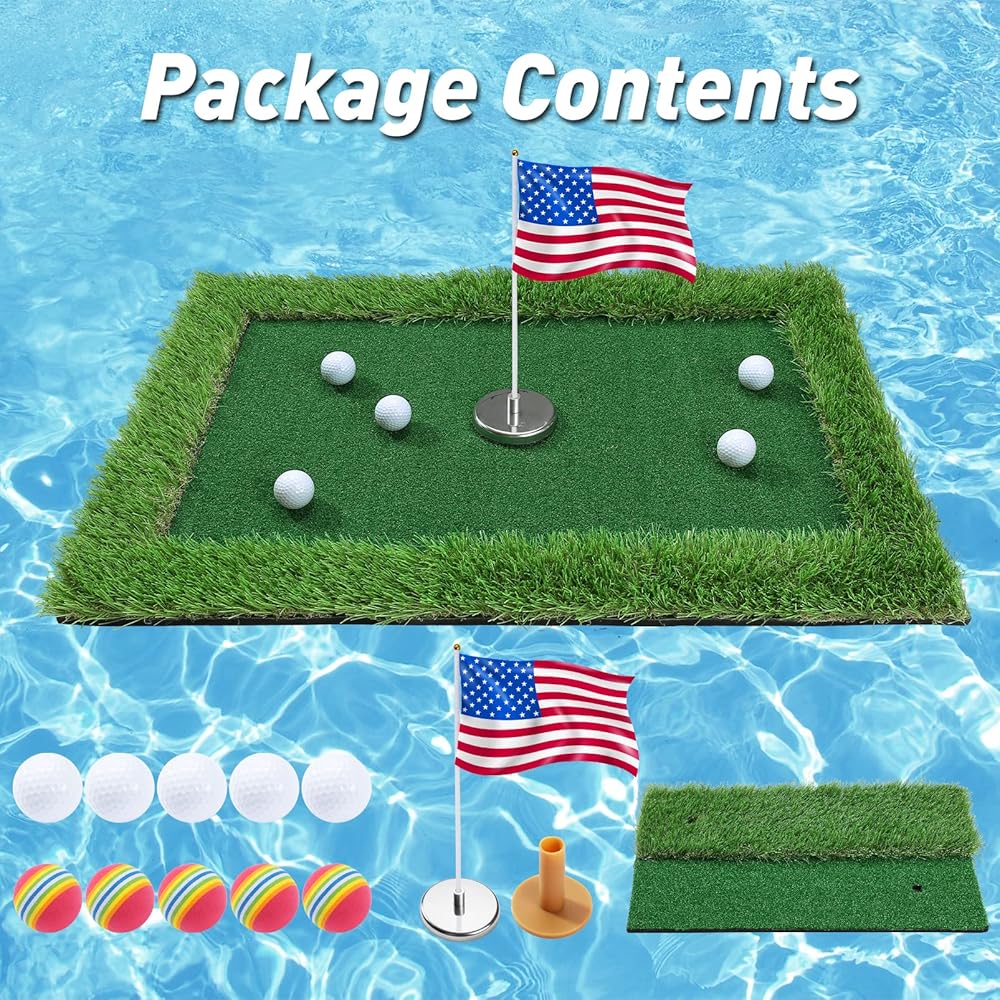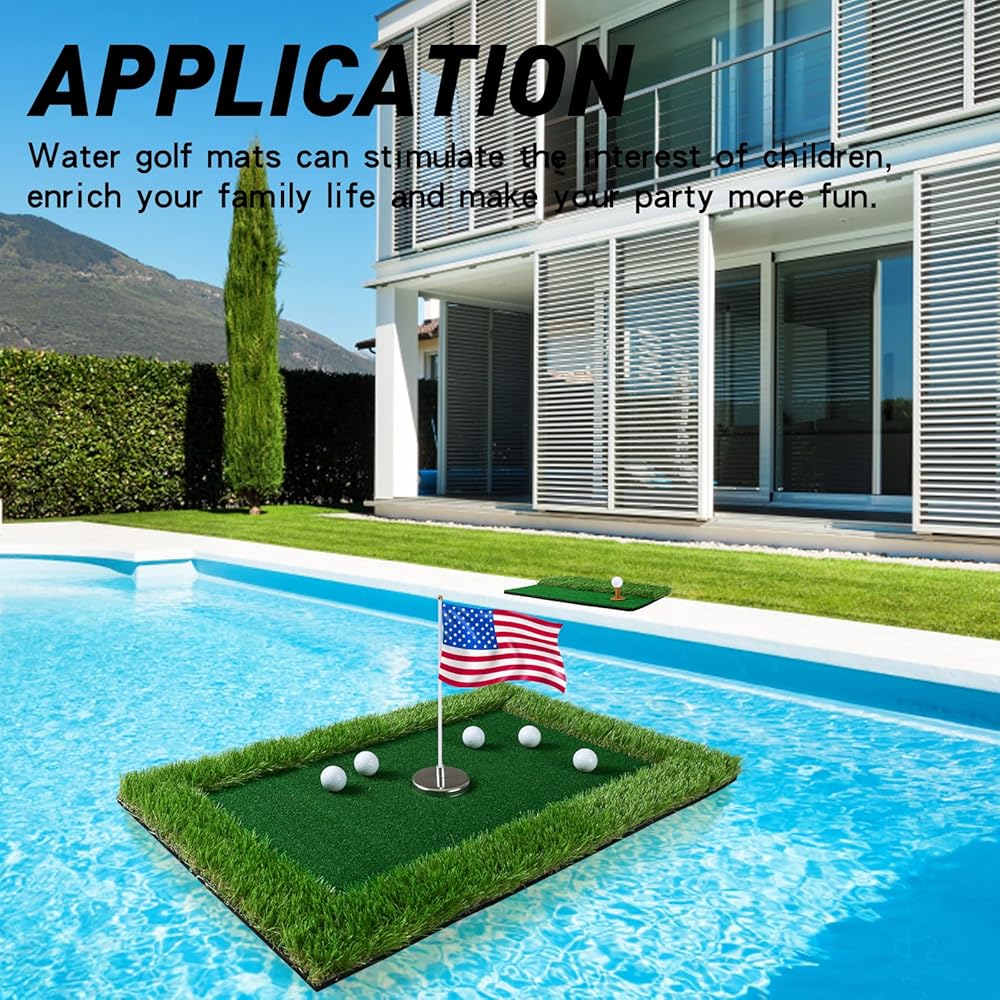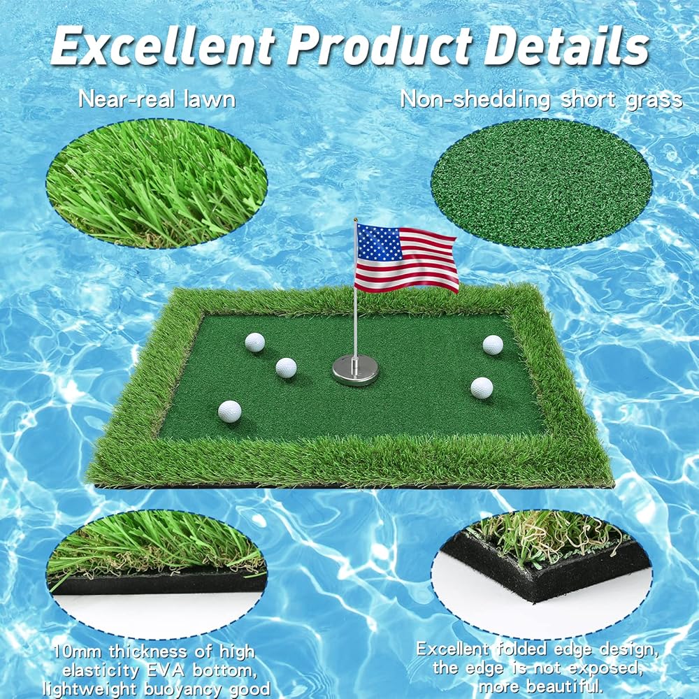 The product is a floating golf green, made of high-quality nylon grass, stable and not easy to fall, high density, durable and anti-strike, no odor. 10mm thick EVA backing can easily float on the pool and remain stable when hit.Simulating the real grass provides you with a realistic feel of hitting or chipping the ball, allowing you to enjoy a great game of golf with your family and friends anytime. Also this product is a perfect gift for golf leisure or beginners.