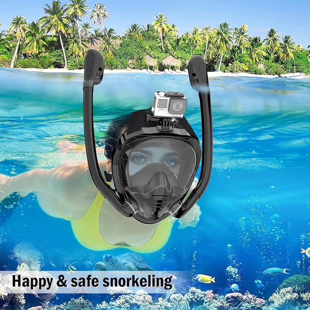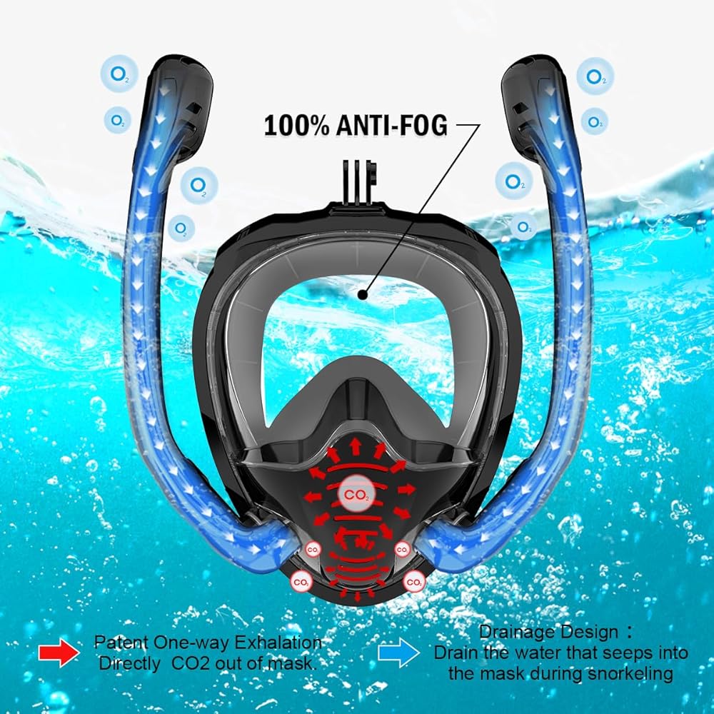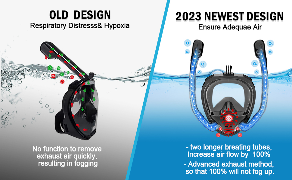 • 🌊【2023 Upgrade】 - Snorkeling Mask with two breathing tubes, compared to the old snorkeling mask, our double blowhole full face snorkeling mask allows for better breathing.Make snorkeling easier by circulating fresh air through your mouth and nose.