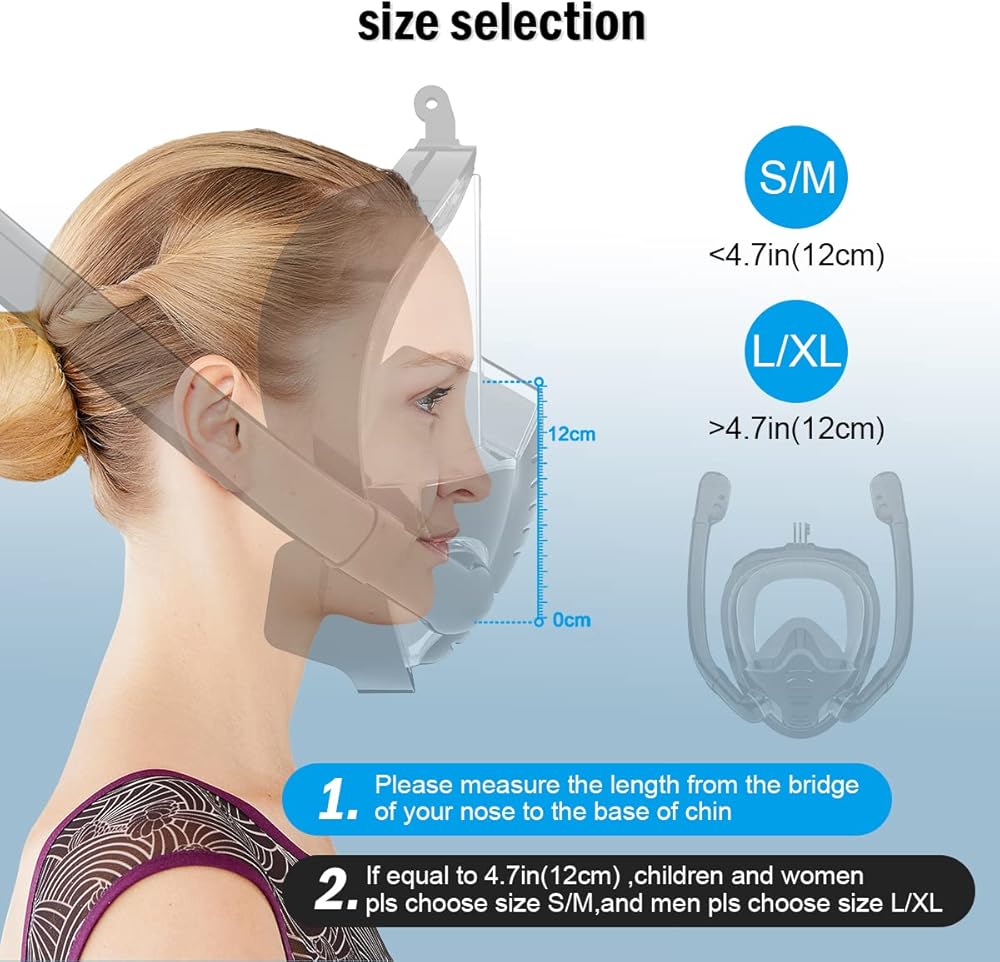 • 🌊【Humanized design】- Adjustable elastic band design, it can suit for all head shapesand sizes. The size is measured from the bridge of nose to the bottom of your chin, if less than or equal to 4.72in(12cm), select size S/M. If more than 4.72in(12cm), select size L/XL.