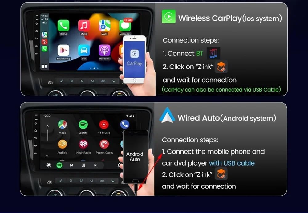 You can choose wired connection or wireless connection to Carplay or Android Auto to connect to your Apple or Android OS phone to access your phone contacts, emails, notifications, maps navigation, music, videos and other information, and voice control.