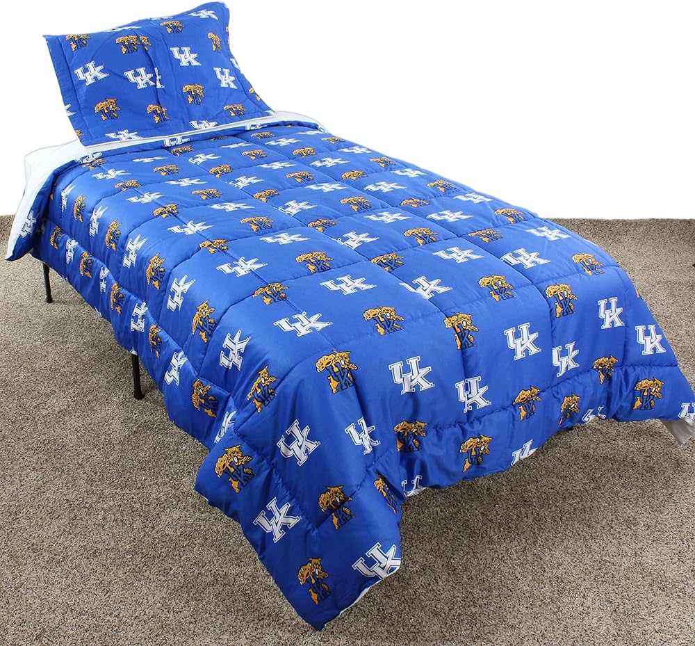 Kentucky Wildcats licensed, College Covers branded comforter set includes everything you might need to decorate a team themed bedroom. Our comforter set comes with: 1 Twin sized reversible comforter and 1 pillow sham. Our sheet sets and dust ruffles are also available, but not included in this set. The comforter measures 68 inches by 86 inches and is quilted to eliminate the poly fill from bunching. Our 100 percent cotton, 200 thread count bedding is machine washable. We recommend to use a oversized commercial washer and dryer to wash and dry to eliminate any fabric rubbing on the sides, this could potentially cause problems. Wash in cold water with like colors and tumble dry on a low heat. Imported.